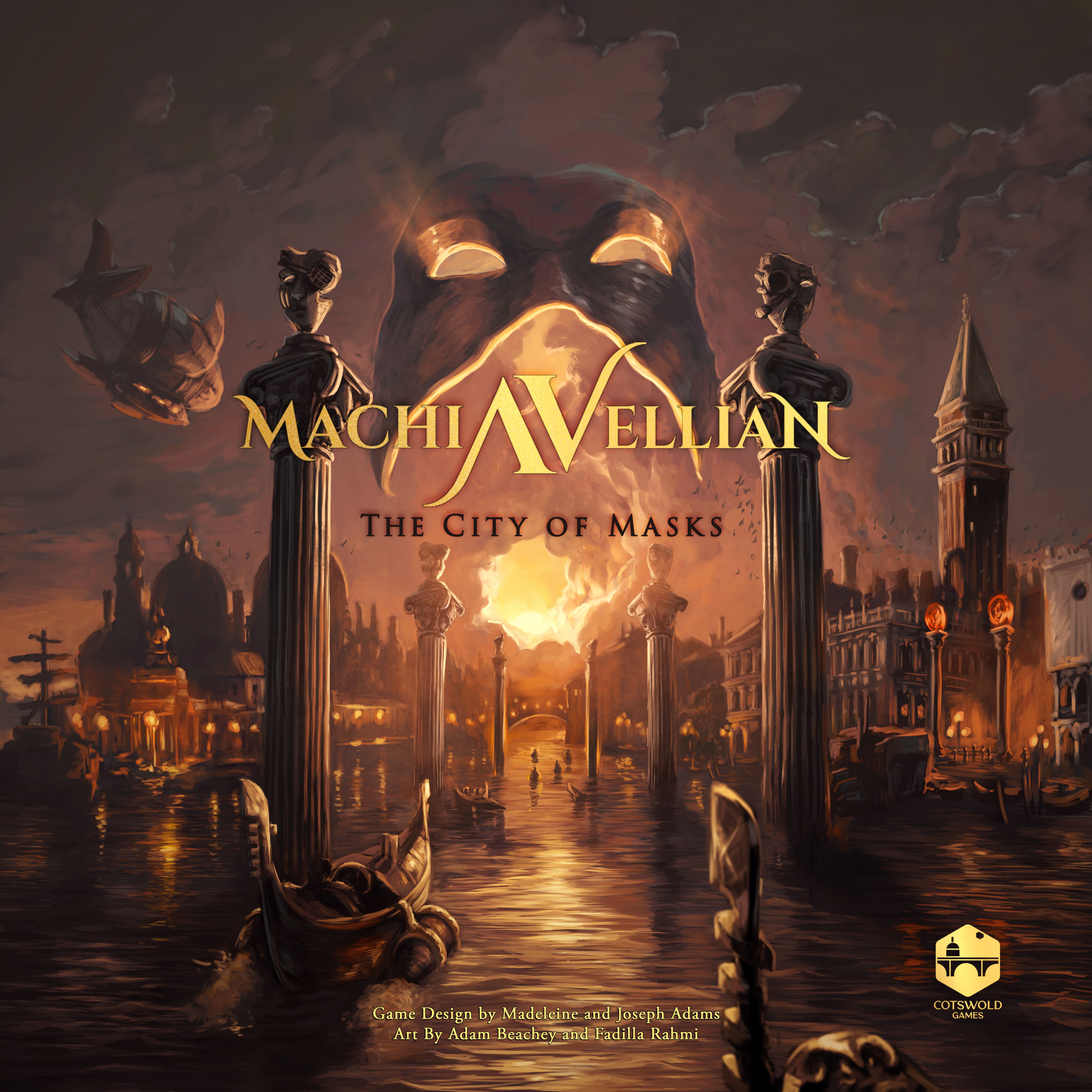 Descrizione: Machiavellian is a big-box euro-style strategy game set in an alternate 1800s steampunk Venice. Niccolò Machiavelli and Leonardo da Vinci’s “Venetian Doctrine” has transformed the city into the heart of a global empire of gears, masks, and intrigue. Senators hide behind ornate masks, crime families thrive in the shadows, and every invention serves the state. In this world, power is theatre, and only the most cunning can rise to the top. Players take the role of ambitious nobles vying to become the next Doge of Venice. To win, you must secure the loyalty of enough Senators through influence, bribery, and manipulation. The game revolves around Favor tokens, the currency of power across six domains (War, Trade, Finance, Politics, Technology, and Crime). You’ll spend Favors to play tech cards, scheme in government buildings, fund wars, bribe Senators, or trade across Venice’s far-reaching markets. At the heart of the game is a dynamic mask placement and combo system: each round you send your masked agent into the halls of power, triggering narrative effects and chaining together bonuses that can shift the balance of the game. Tech cards can be played in multiple ways—discarded for powerful one-time effects, banked for long-term abilities, or cycled back into your hand for repeated use—giving you a wealth of tactical options. The ultimate goal is to gather enough Senatorial support to seize the Dogeship. You can win instantly by assembling the right combination of Senators, or by building overwhelming reach across the Venetian Concordium. Every choice matters: will you rely on wealth and diplomacy, or intimidation and war machines? In Machiavellian, masks will fall, alliances will break, and only the most ruthless strategist will be crowned Doge-for-Life. —description from the publisher