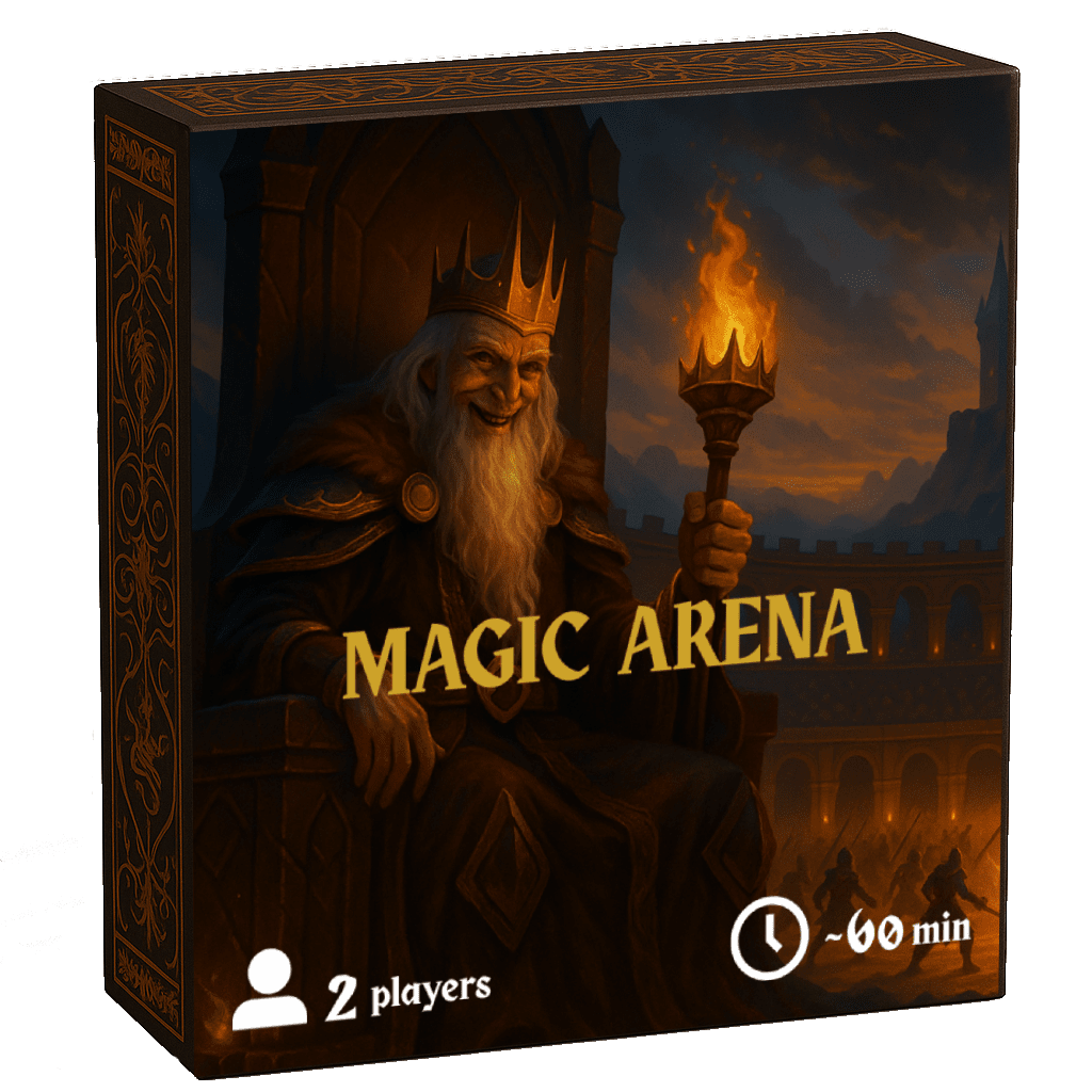 Descrizione: Magic Arena is a dynamic strategic card game set in a dark fantasy kingdom ruled by a bored and wicked king. To escape his eternal boredom, the king hosts the legendary Magic Tournament — a brutal competition where 32 unique magical characters fight for glory and powerful artifacts.