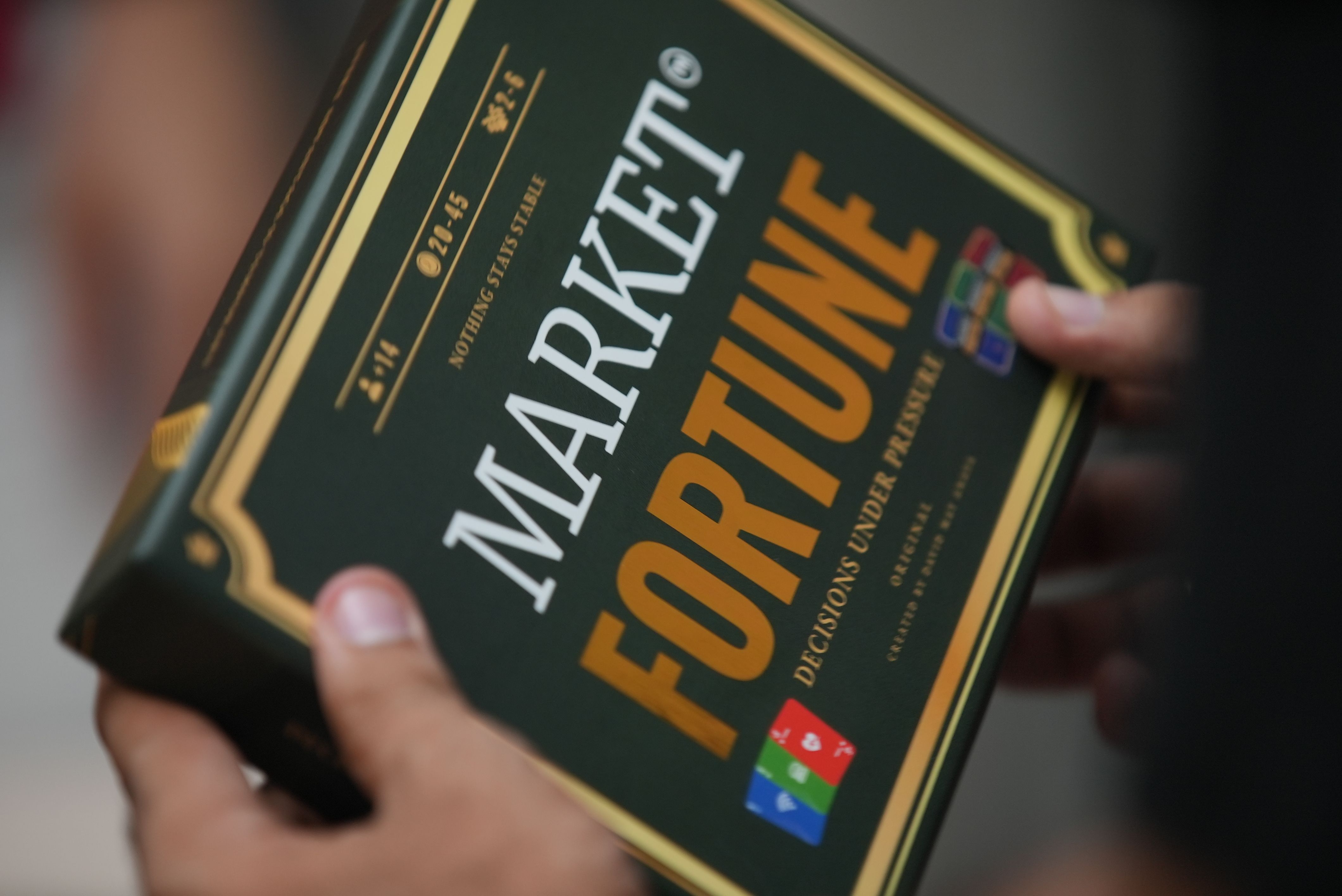 In Market Fortune, you're building a portfolio of investments while disrupting your opponents' plans through a shared strategy deck. The first player to form 4 investments worth 25M or more wins.