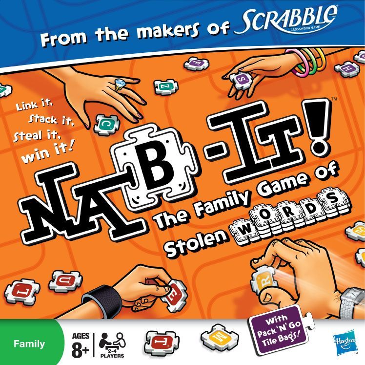 Descrizione: Nab-It! is reminiscent of the word game Upwords in that players can stack letter tiles on existing letter tiles in order to create new words, but there are three differences: (1) the game includes no board, (2) each player has her own set of tiles in a particular color, and (3) the player who has the highest or most tiles in a word scores one point for that word (no matter how long) once the game ends.