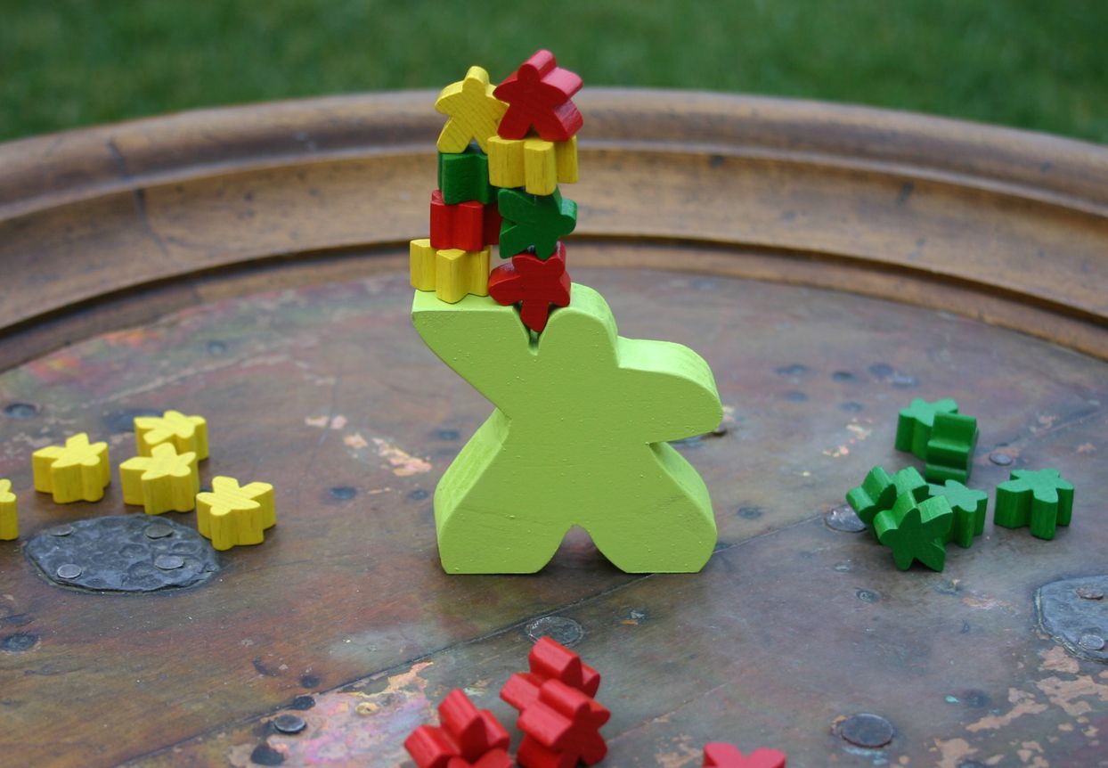 Players take turns stacking their Meeples on top of the Megameeple's raised arm. The first player to place 7 Meeples on the pile without knocking any Meeples off is the Meeple Master.