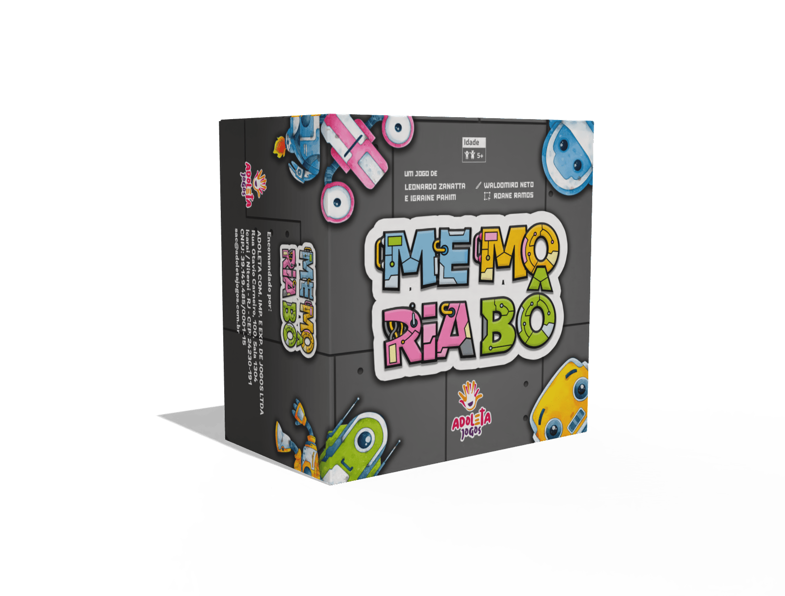 Descrizione: In Memoriabô, children are invited to build robots. The parts are obtained through a memory-based mechanic—searching for matching pairs of robot parts on a grid of 16 face-down cards. When a player finds a pair (either identical cards or cards of the same color), they collect them and take them to their laboratory, where they’ll assemble their robots.