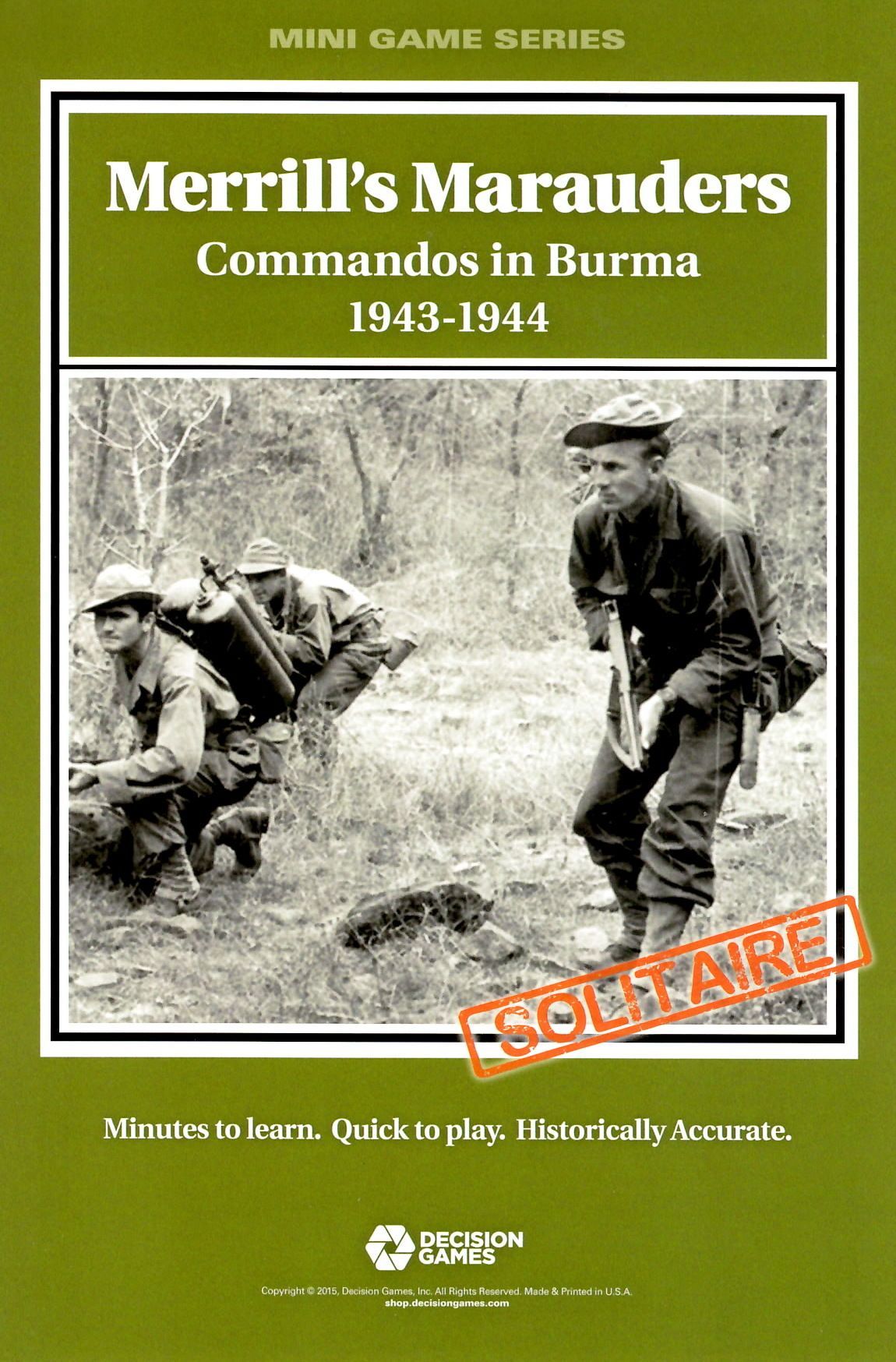 Descrizione: Merrill’s Marauders is a solitaire game covering missions behind Japanese lines in the Burmese jungle. The player has to carry out one of four missions, or string all four together in a campaign game.