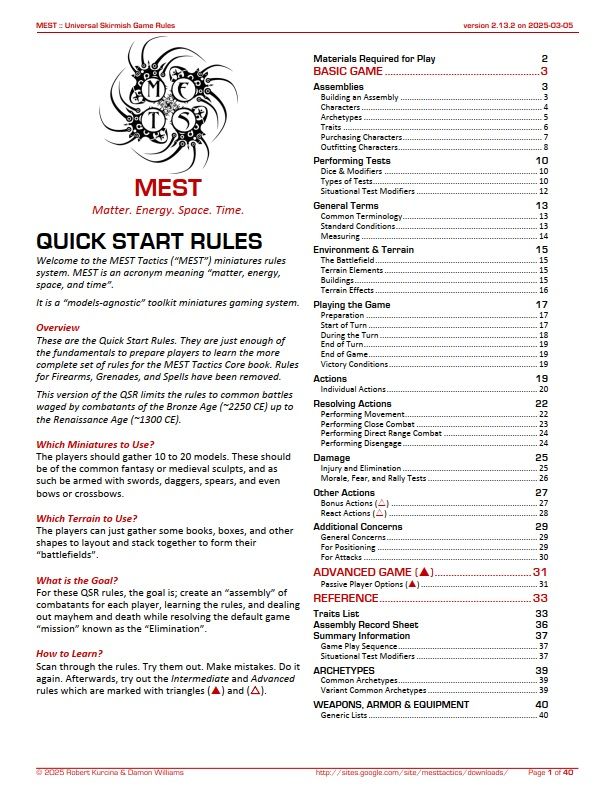 Descrizione: The MEST Narrative miniatures rules system is designed to be a flexible light-weight set of features that can work with numerous genres such as Swords & Sandals, Medieval, Swashbuckler, Wild West, Horror, Victorian Adventure, Pulp Heroes, Modern Battles, Future War, Sci-Fi, or Superheroes.