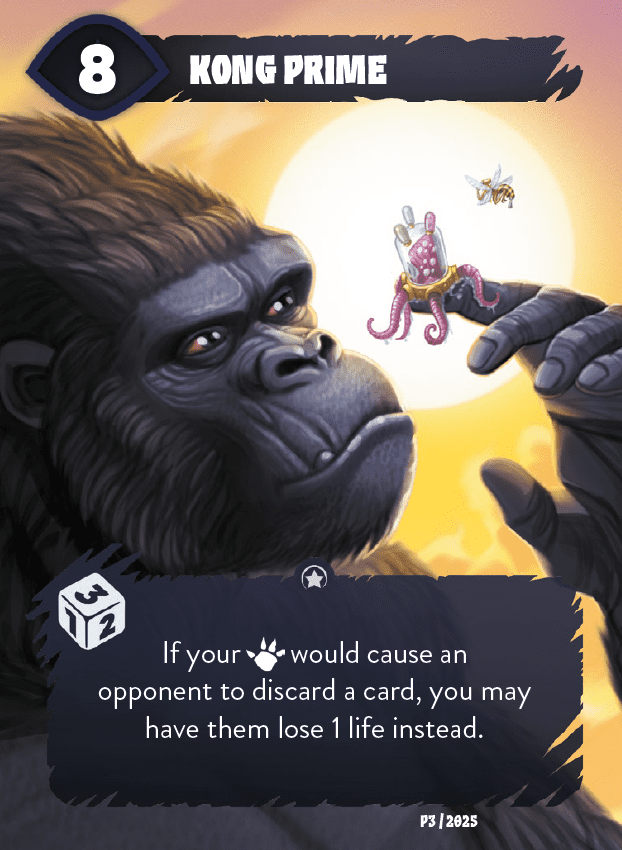 Descrizione: A promo card specific for Mindbug x King of Tokyo, distributed at SPIEL Essen fair in 2025. Name: Kong Prime Power: 8 Keywords: none Icon: 1 die roll icon Text: If your [claw/discard icon] would cause an opponent to discard a card, you may have them lose 1 life instead. Card number: P3 / 2025