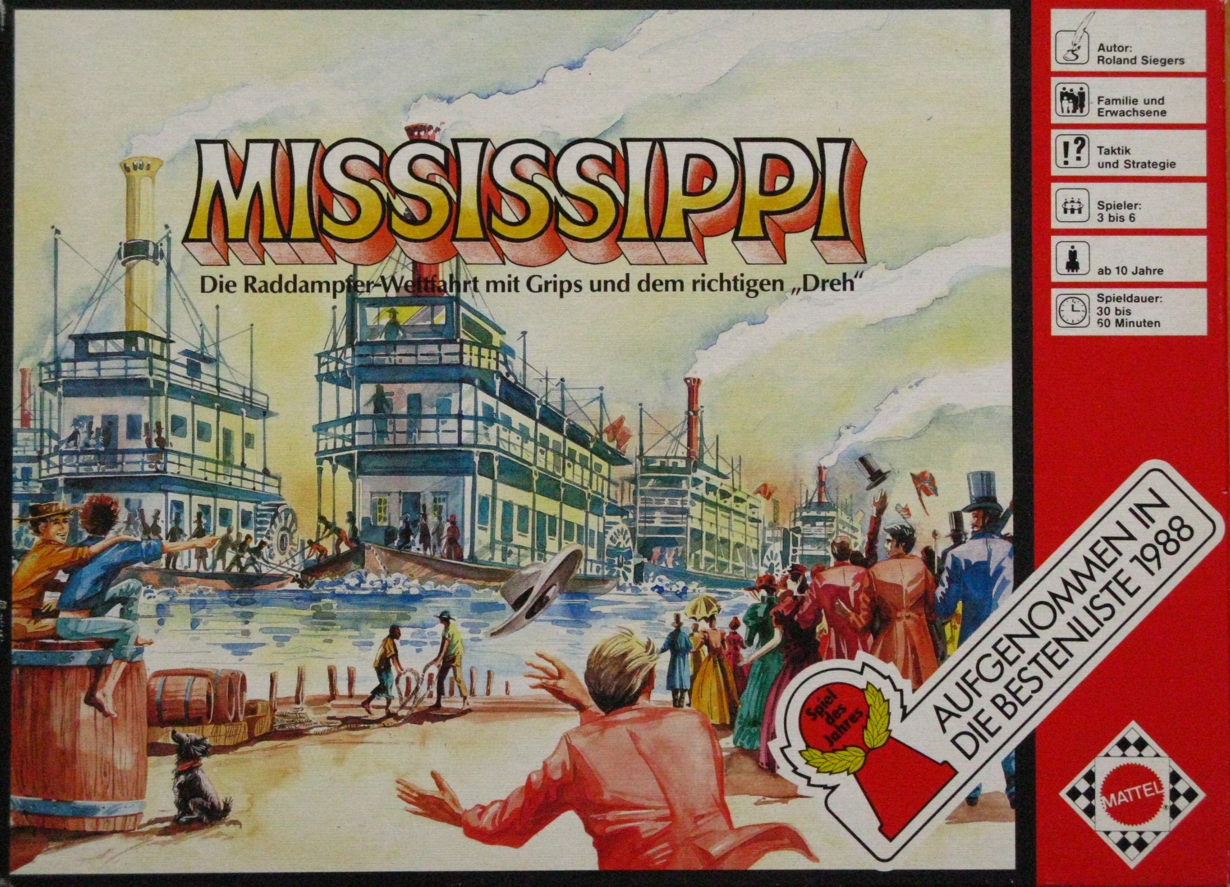 Descrizione: An abstract race game set on the Mississippi river. Each person has a boat (actually a hexagonal piece with the numbers 1-6 written on each of the 6 sides of the piece). The board is a long track of hexes that wind back and forth in an 'S' pattern. Each person places his 'boat' on the start space with one of the numbers facing forwards. Each person also starts with a number of 'Logs'. These are used to move your boat forward 1 space for each log spent. (You can also decide to move backwards - gaining 1 log for each space moved back).