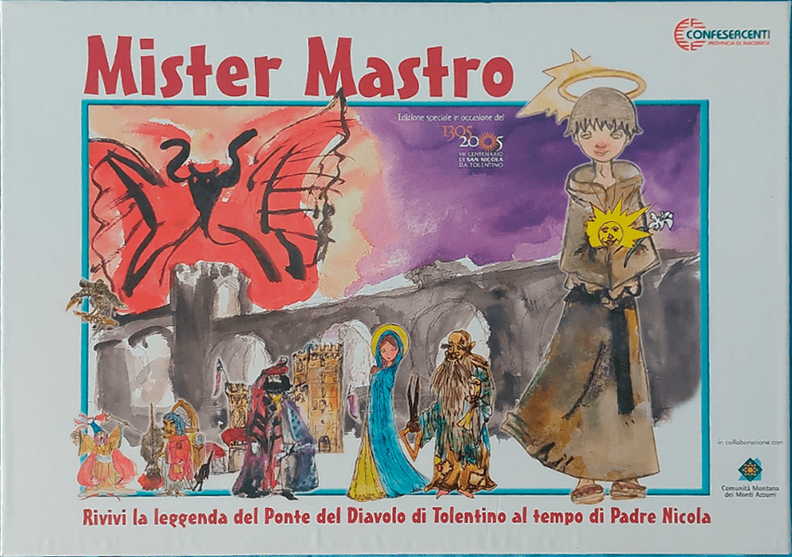 The board game recalls the legend of the construction of the Devil's Bridge of Tolentino, as it was written and handed down by the Augustinian, Father Domenico Gentili. The story tells of the providential and miraculous intervention of Saint Nicholas, who, with a stratagem, mocked the devil who wanted to seize the first soul that passed over the bridge. The game also reconstructs the history of Tolentino in 1200 and the life of Father Nicholas.