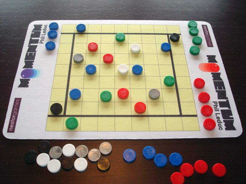 Descrizione: Momentum is a dynamic abstract strategy board game in which the lead swings back and forth like the steel spheres of Newton’s cradle. Grabbing the lead and holding onto it is the challenge.