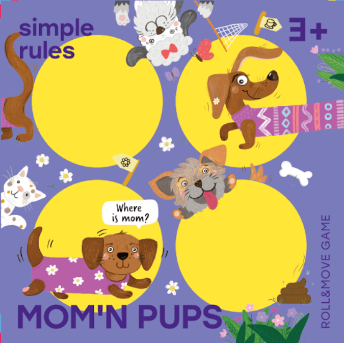 Descrizione: The pups are running along the path; mom is coming towards them. Collect sugar bones along the way, and do not forget to bark loudly if you encounter a cat! And sometimes, oops, you need to take a break - well, we've all been there.… When reuniting, warm hugs are awaiting mom and her pups, and not only on the game board! The goal is for the mother dog and her puppies to meet on the same square of the game board. Players take turns rolling a die and moving their figurine according to the result. Puppies always move towards their mother, and the mother always moves towards her pups. If a player lands on a square with a cat, they bark; with a bone, they lick their nose; with another dog, they shake hands, hug, or rub noses. The game ends when all the puppies and the mother are on the same square. If a puppy and the mother meet during a turn, they stop at that spot and wait for the other puppies to join them.