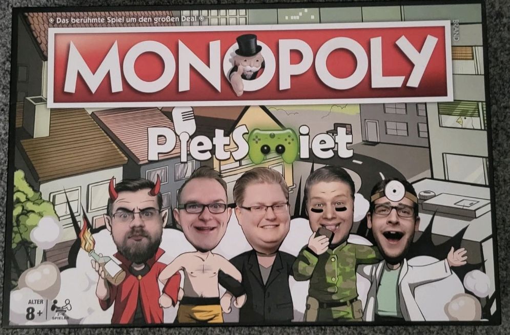 Descrizione: A Monopoly themed around the german content creator group PietSmiet. Theme Players take the part of land owners, attempting to buy and then develop their land. Income is gained by other players visiting their properties and money is spent when they visit properties belonging to other players. When times get tough, players may have to mortgage their properties to raise cash for fines, taxes and other misfortunes. Gameplay On their turn, a player rolls two dice and moves that number of spaces around the board. If the player lands on an as-yet-unowned property, they has the opportunity to buy it or auction it to the highest bidder. If a player owns all the spaces within a color group, they may then build houses and hotels on these spaces, generating even more income from opponents who land there. If they lands on a property owned by another player, they must pay that player rent according to the value of the land and any buildings on it. There are other places on the board which can not be bought, but instead require the player to draw a card and perform the action on the card, pay taxes, collect income, or even go to jail. Goal The goal of the game is to be the last player remaining with any money