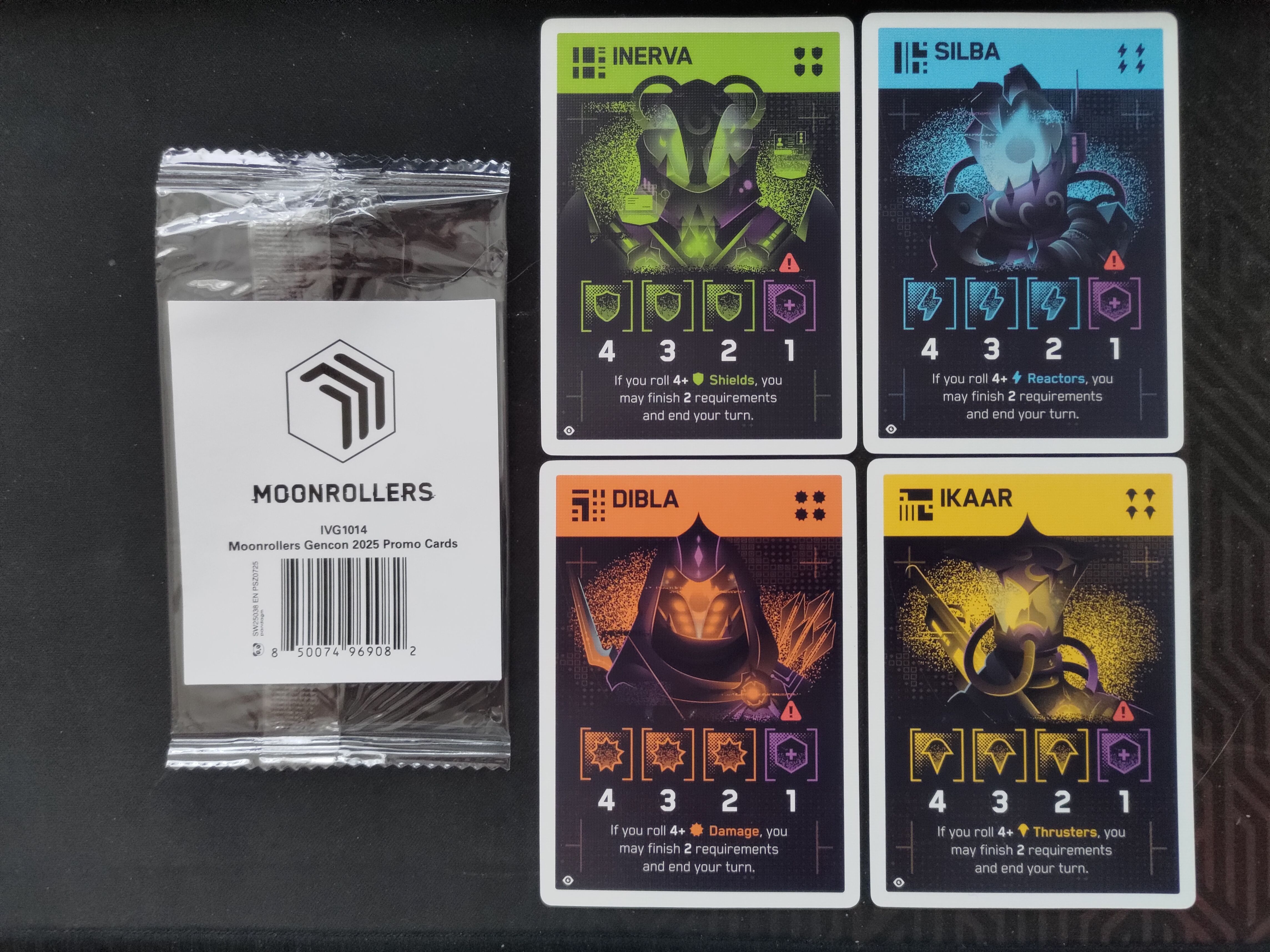 Descrizione: Promo pack of four crew cards for Moonrollers that was distributed out to attendees of GenCon 2025.