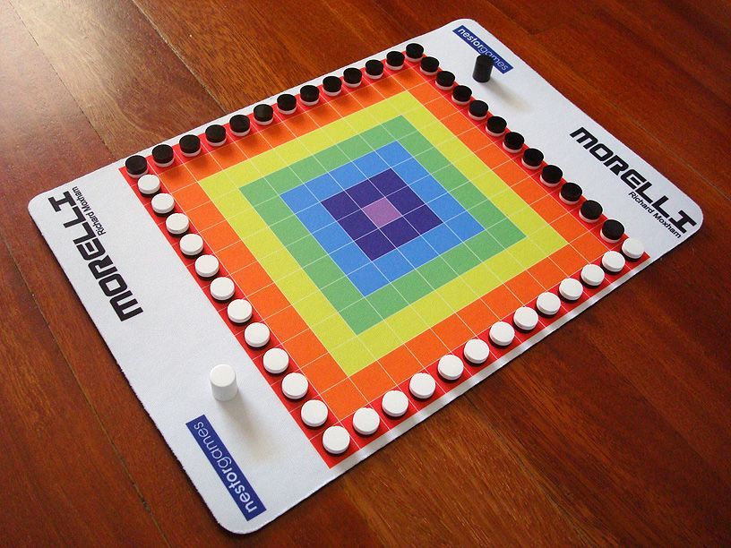 Descrizione: Morelli (named for a character in Julio Cortázar's novel Hopscotch) is played on a board divided into 13 x 13 squares and coloured in concentric bands with the successive shades of the rainbow: outermost band of 48 squares in red, through orange, yellow, etc., to a single central cell (the Throne) in violet.