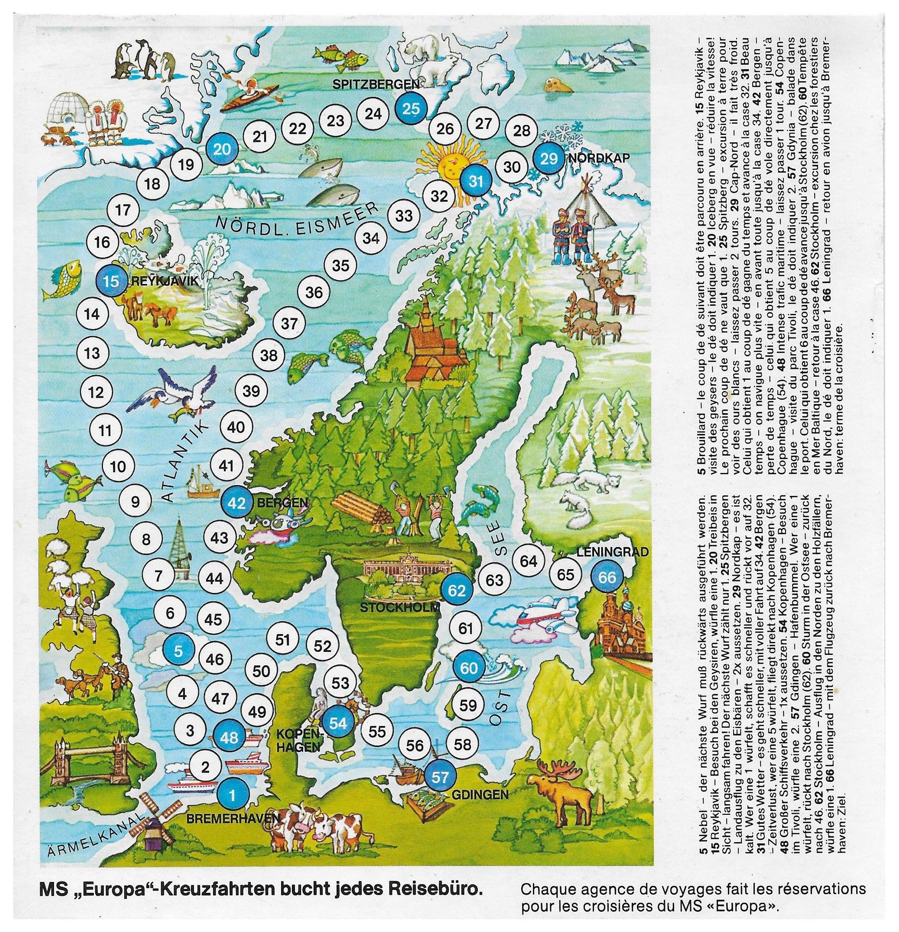 Descrizione: The players take turns to roll and move. On some spaces events hinder or benefit the players. The players start at Bremerhaven and the first to arrive on space 66 (Leningrad) wins the game.