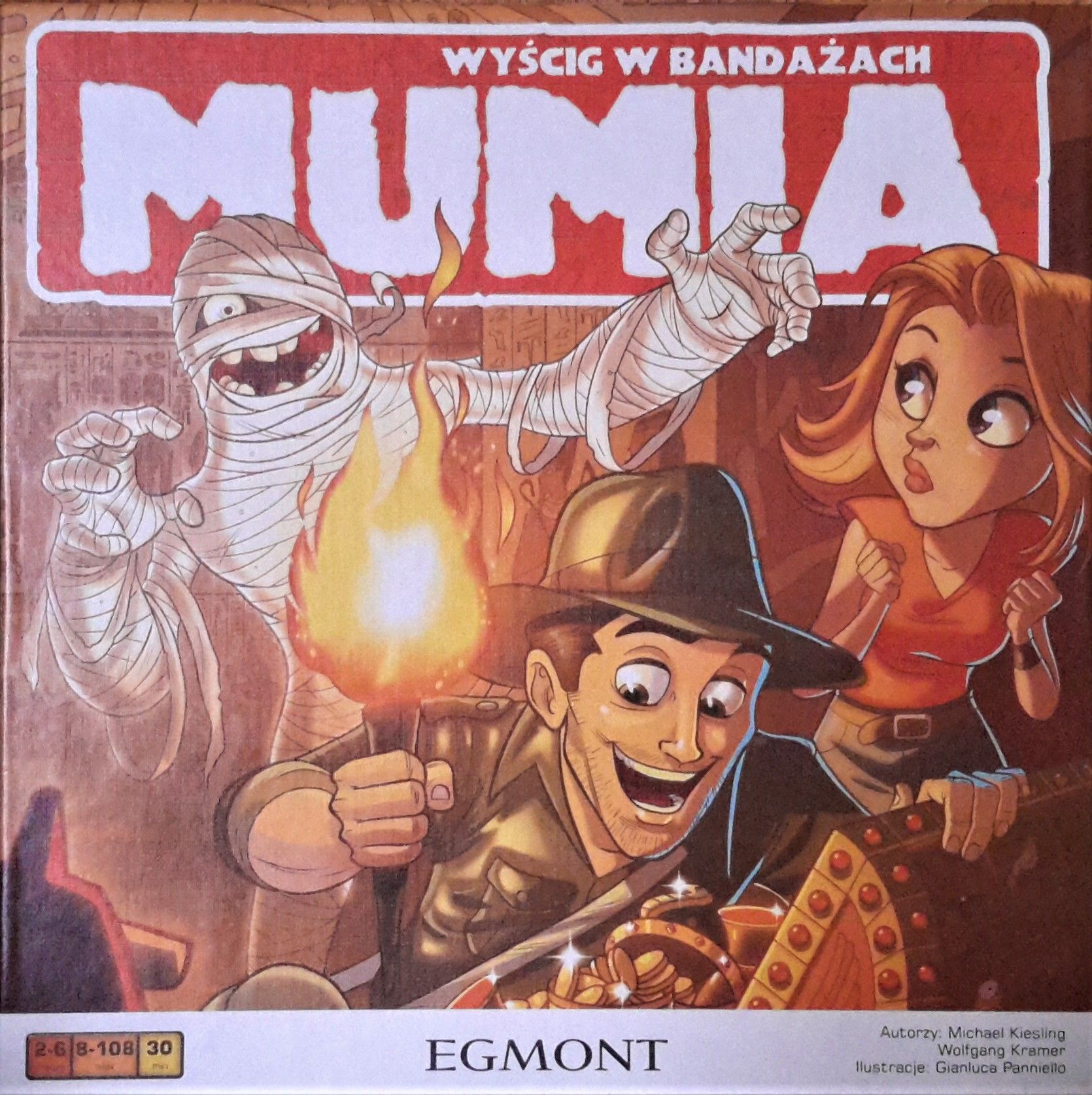 Descrizione: Mumia: Wyścig w bandażach ("Mummy: The Race in Bandages") is a roll-and-move game in which players try to gather the most valuable tiles from the board. The tiles can be positive (+1 to +8) or negative (-1 to -10). There are also camel tiles which convert negative values into positive. The last pawn leaving the tile has to take the tile from which it leaves. Sometimes players may or have to move the mummy or guards which provide some meaningful choices to the game. At the end of the game the player with most points wins.