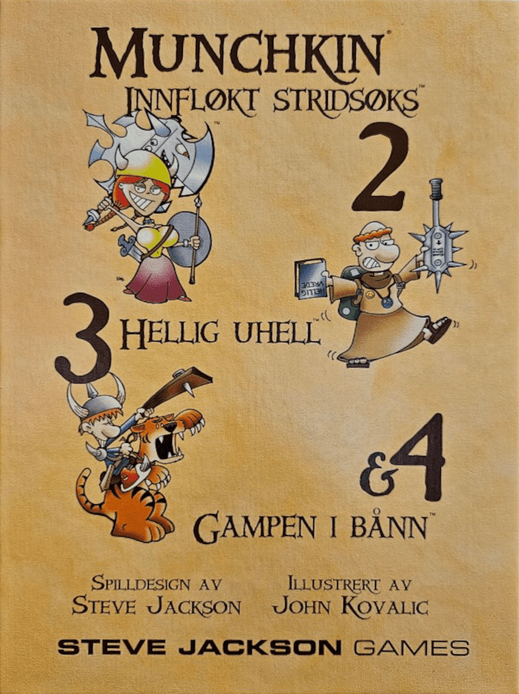 Descrizione: Munchkin expansion sets 2, 3, and 4 are released together in Norwegian. These three expansions introduce the ability to play as an orc or a gnome, become a bard entertaining for dear life, acquire a loyal steed or hireling (or even both), and feature outrageous weapons, unpredictable equipment such as weapons, armor, and other useful tools, as well as terrifying enemies of all kinds.