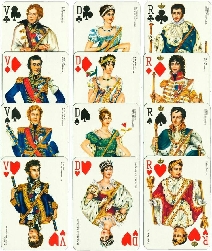 Descrizione: Napoleon is a 5-6 player standard deck playing card game with shifting and secret partnerships. A standard deck of cards is dealt evenly, with the remaining cards being placed in the kitty. Players bid on the number of face cards that will be captured by their team. The player with the highest bid becomes Napoleon. Upon winning the bid, Napoleon names trump, the secretary card and may exchange cards with the kitty. The owner of the secretary card becomes Napoleon's secretary. The secretary's identity is kept hidden from all players, including Napoleon. Napoleon and Napoleon's secretary must meet or exceed their bid to score points, the other players must block Napoleon and his Secretary from reaching their bid count to score. Many different point systems and variants are used for this game.