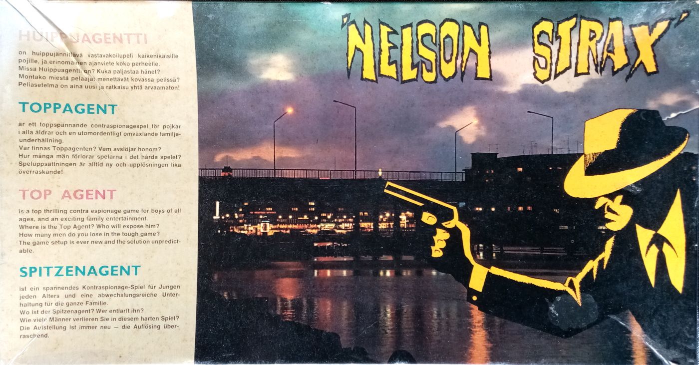 Sixty-eight chits are distributed face-down on an 8x9 grid. Ten of these are bombs, while the rest are foreign agents of varying value, including the Top Agent 'Nelson Strax' himself! Players each start from one of the empty corners with one of their own four agents (pawns) and move on the board by rolling a d6 and turning over chits for points. Finding a bomb causes the pawn to 'die' immediately and the player can start with a new one from their corner; losing all of their agents means the player is out of the rest of the game, but can keep the points collected so far.