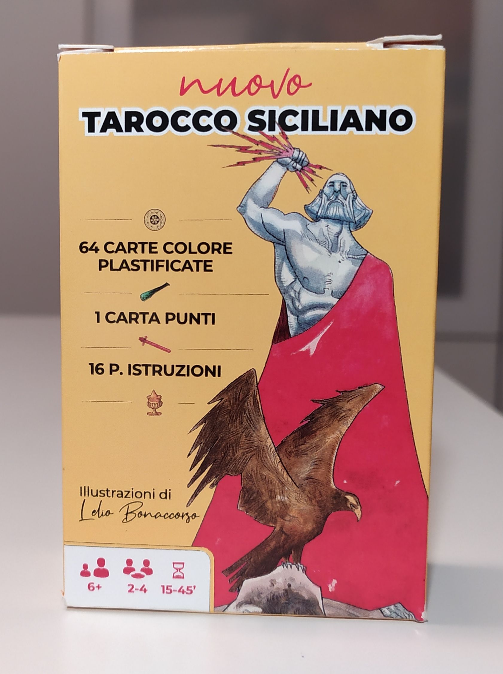 Descrizione: The ancient classic point trick taking game with trumps played with a special pack of 63 Sicilian Tarocchi, in a new version optimized for modern and international players, from the extraordinary brush of the cartoonist and illustrator Lelio Bonaccorso. The oldest trick-taking game played in Sicily, today is in the Register of Intangible Heritage - UNESCO of the Sicily Region.