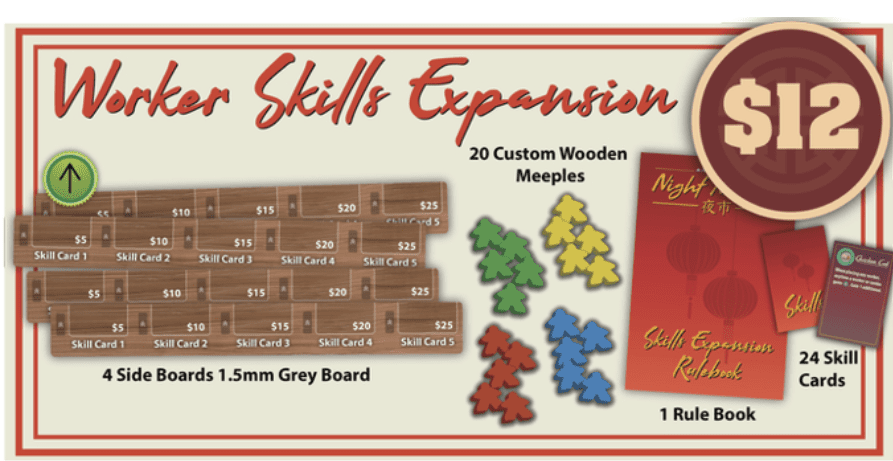 Descrizione: The Skills Expansion will give your workers asymmetrical skills. Each player will have the opportunity to give their workers skills to enhance their play. These skills are unique and once acquired you get to keep the power for the remainder of the game. This will add another crunchy layer of gaming goodness to the Night Market Experience.
