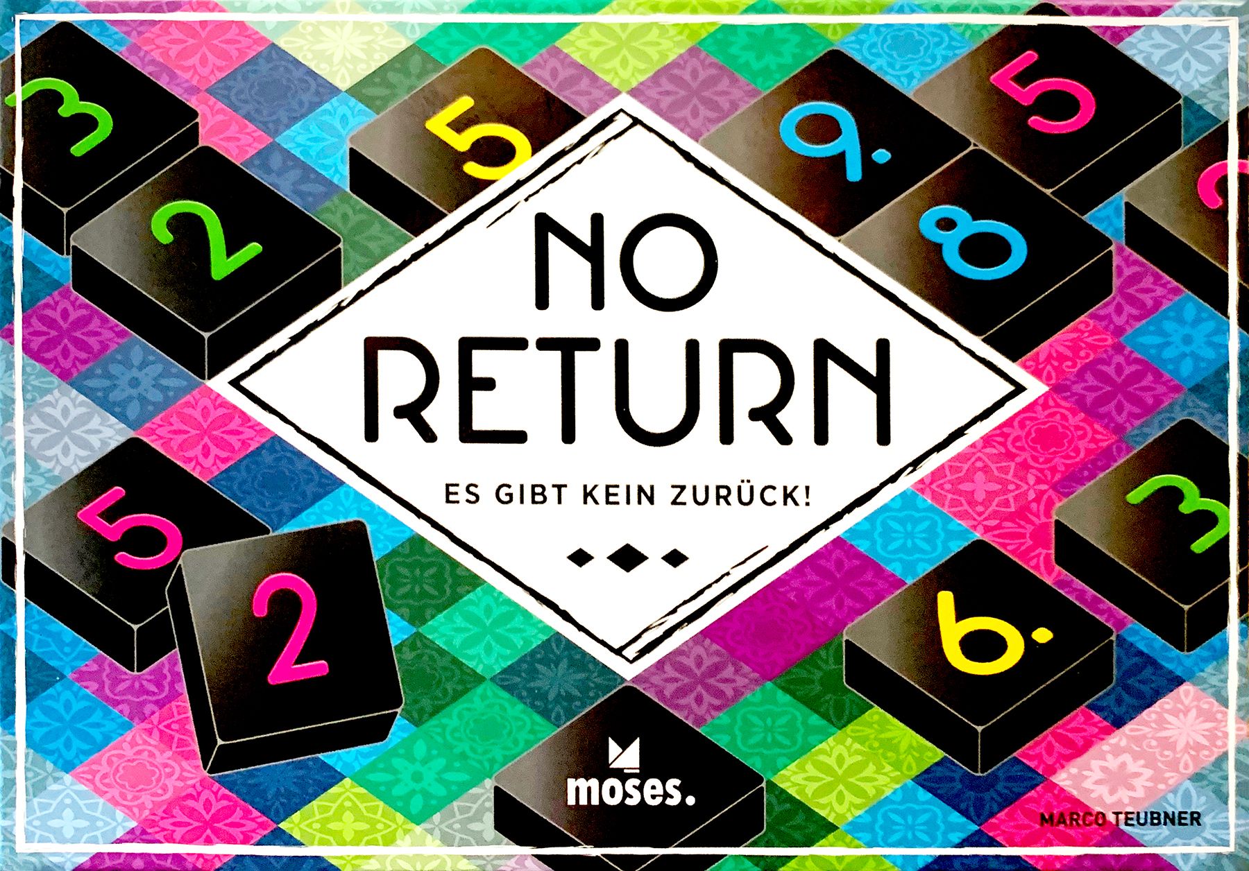 Descrizione: No Return: Es gibt kein zurück! ("There's No Turning Back!") is played in two phases, with players collecting tiles in phase one, then scoring their tiles in phase two. People move into phase two at their own pace, and once you go in, you're there for the rest of the game — which might not be long!