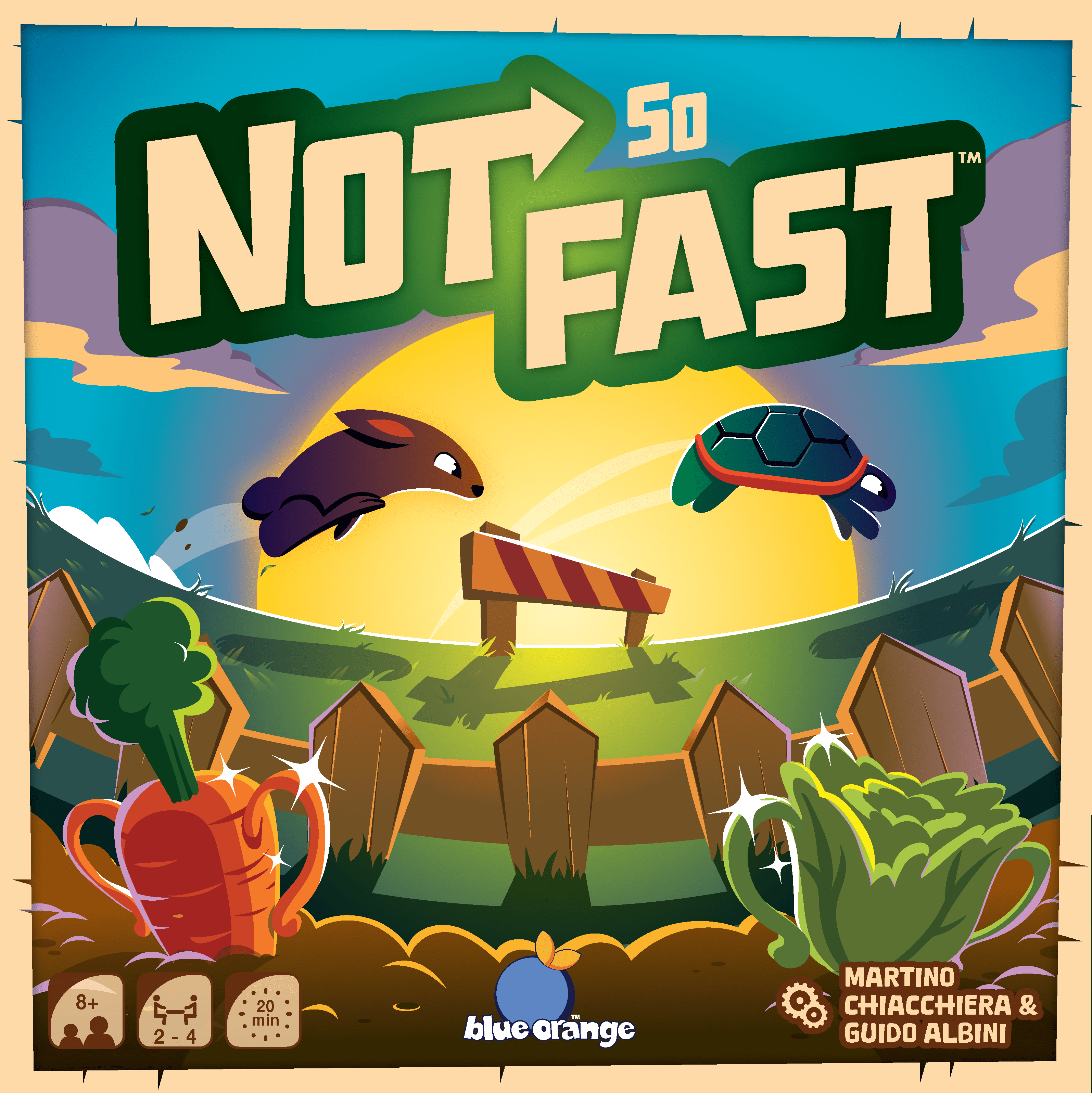 Descrizione: Not So Fast is a lighthearted race game where hares and tortoises dash toward an open vegetable patch, but speed alone won’t secure victory. Each player secretly supports one team color, aiming to guide both its hare and tortoise to arrive at just the right moments. With limited scoring spaces and different rewards for fast and slow animals, patience and timing are just as important as forward motion. On a turn, a player reveals a movement card that determines which pawn can be moved—by animal type or by color—and advances it one space along the track. Pawns can stack, and when a pawn moves from the bottom of a stack, every pawn above it is carried forward and then spreads out, sometimes helping rivals as much as yourself. As pawns pass through the gate into the vegetable patch, they fill scoring spaces in order, with each space awarding different point values depending on whether a hare or a tortoise occupies it. Only the first seven pawns to arrive will score, increasing the tension as the finish line approaches. The game ends once all seven scoring spaces in the vegetable patch are filled. Players reveal their hidden team cards and total the points earned by their matching hare and tortoise. The highest total wins, with ties broken by which player’s pawn entered the vegetable patch first. Not So Fast blends bluffing, shared movement, and tactical restraint into a compact race where moving at the wrong time can be just as risky as not moving at all. —description from the publisher