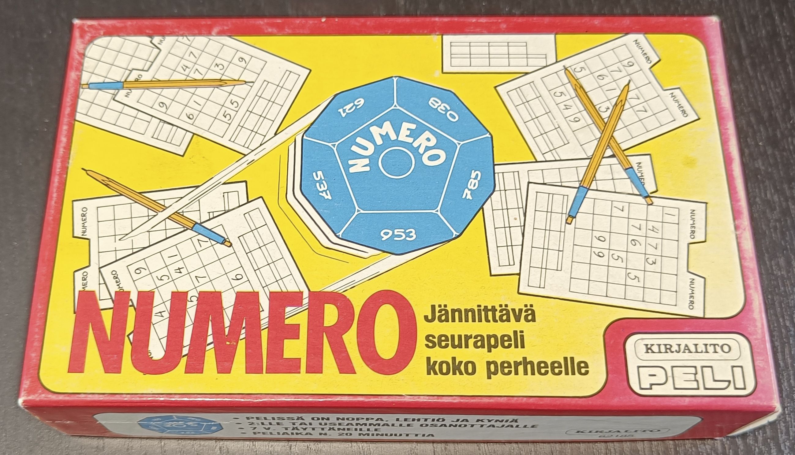 Descrizione: The game is played using a special twelve-sided die, containing several three digit numbers on the sides. The player who rolled the die chooses one digit of the rolled number, and everyone must write down that number on any square on their 6*6-grid. There is also a NUMERO- and a X-side on the die. When NUMERO is rolled the player who rolled it, can choose any number from 0 to 9 for everybody to write down. If X-side is rolled the player looses their turn. After the roll the die goes to the next player. When the sheets are filled, every players counts the lines with at least three of the same consecutive numbers (diagonals are allowed). For every line you get as many points as there are numbers on the line. Winner is the player who got most points.