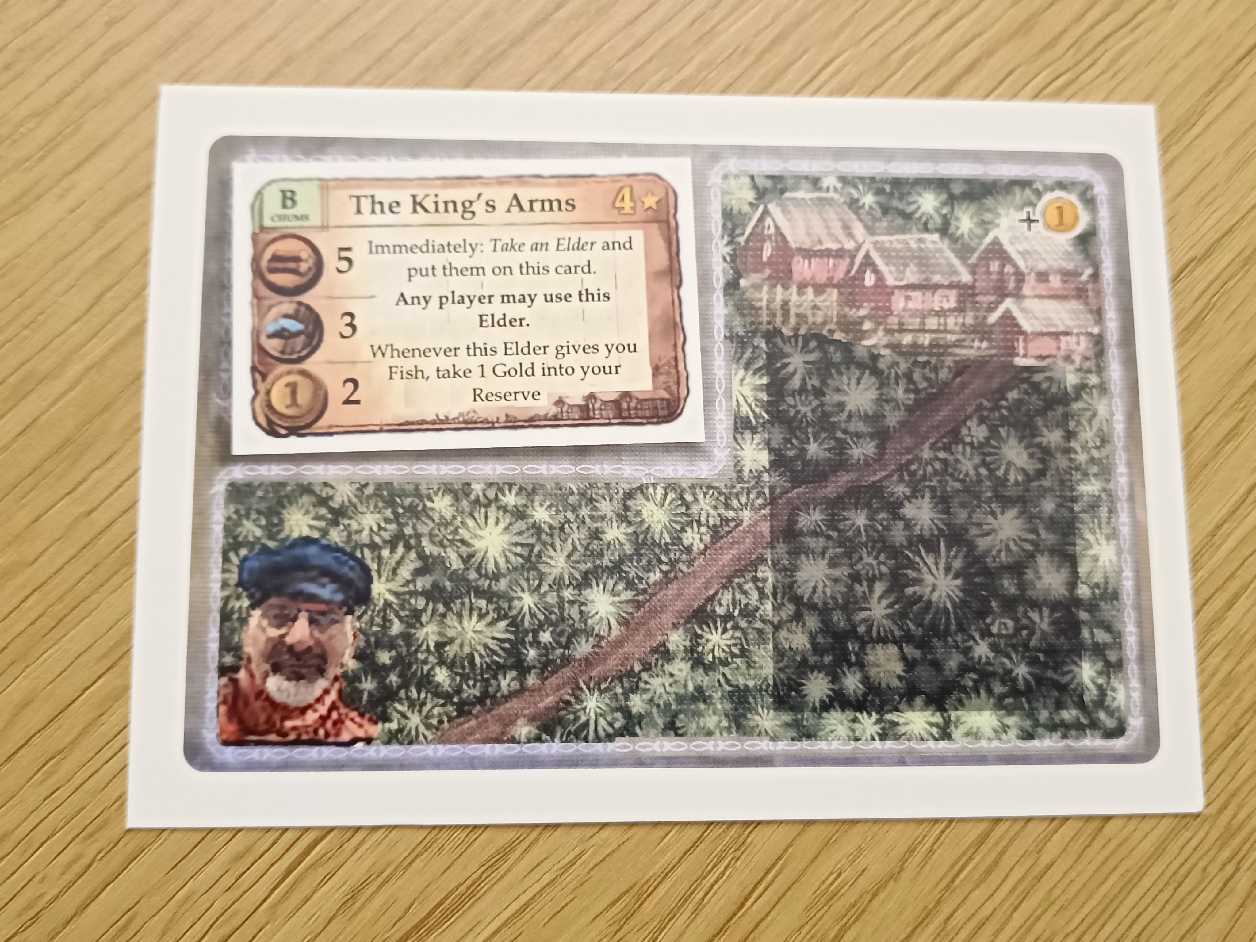Purchasing the card requires 5 wood, 3 fish and 2 gold. When built, it covers a 2 x 2 board area and the card includes a building called The Kings Arms'; the building is worth 4 Points at game end. The building's instructions include placing an Elder on the tile for use by all players; when the Elder would 'give fish', the owner takes 1 Gold into their reserve.