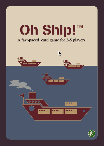 Oh Ship! is a card game where players are dealt 4 cards to represent their ship, and will take turns drawing and playing cards to learn about and make changes to their ship's contents with the goal of setting sail before their opponents are ready. Rounds continue until one player plays an action to set sail where each player gets a final turn and scores are calculated. THe highest score wins the round. The first player to win 5 rounds is the game winner.
