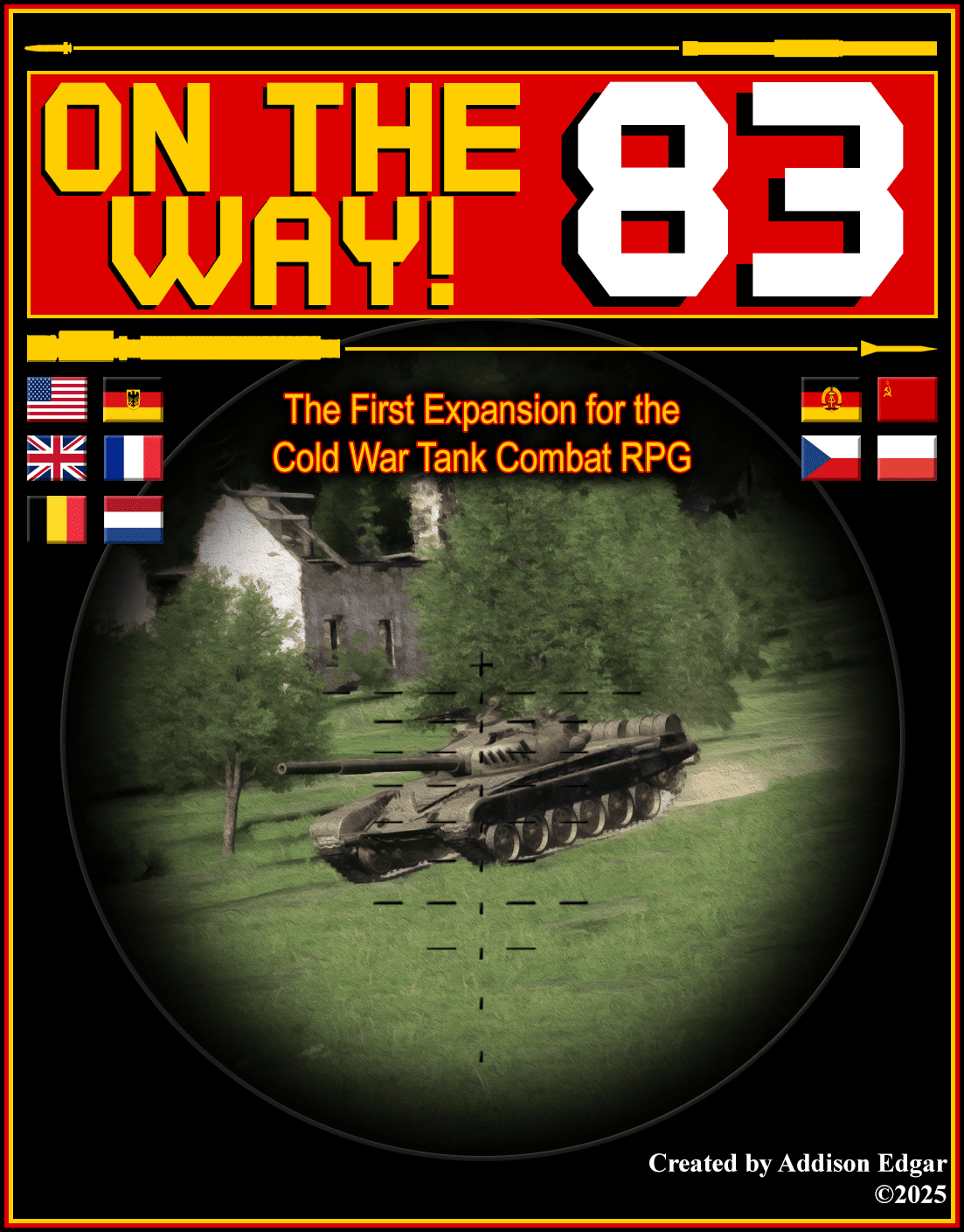 Inspired by the legendary Avalon Hill classic, Patton’s Best, the On the Way! 83 expansion for On the Way! intends to capture much of the outstanding realism, abstraction, and excellent campaign of Patton’s Best in its own unique way, making it a fresh and original game. A few select differences and additions from the original Patton’s Best system are: Rules for dawn, dusk, and night combat, as well as night vision devices (infrared, thermal, etc.) and other Cold War gadgets like advanced two-plane stabilizers and auxiliary driver and/or gunner controls; a comprehensive selection of period-appropriate ammunition, including APFSDS (Armor Piercing Fin Stabilized Discarding Sabot) and ATGM’s (Anti-Tank Guided Missiles); sixteen (vice the original 4 of the base game!) playable tanks representing the most common types that would be available to each respective nation and unit in mid-to-late 1983 (the M60A3 TTS and M1 Abrams (US), Leopard 1A1A1 and Leopard 2A1 (West Germany), Leopard 1 (BE) (Belgium), Leopard 1 (NL) (Netherlands), T-55A (Czechoslovakia, East Germany, and Poland), T-72 (East Germany), and T-62, T-64A, T-64B, and T-72A (USSR)); a detailed tank damage system, accounting for non-KO penetrations, hits by kinetic energy and chemical energy projectiles, as well as detailed crew wounds and a brand new bail-out minigame to resolve the abandoning of your tank turn-by-turn; condensed and specific objectives with particular mission end conditions to specifically avoid mental fatigue and cut out tedium; and much, much more! Additionally, the game has been intentionally designed with modularity in mind in order to account for potential expansions set in later decades (such as this first expansion, On the Way! 83) with the introduction of advanced systems like thermal technology and explosive reactive armor (ERA), as well as support for WWII campaigns.