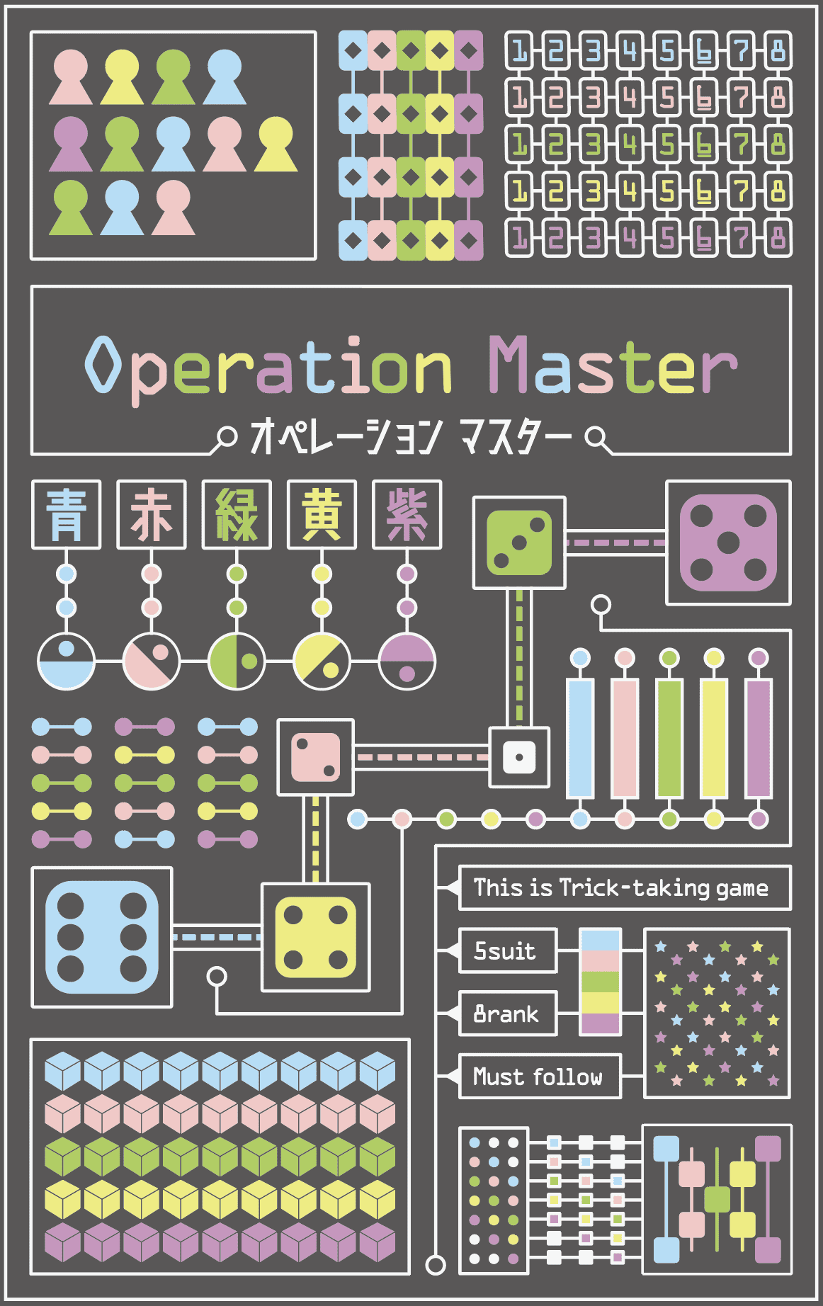 オペレーションマスター (Operation Master) is a peculiarly quaint trick-taking game with dice and cards. You receive dice each time you win a trick. The dice you receive counts as your VPs (victory points). Strive to win each trick with the right sense of timing, while being attentive to all dice on the table. That is indispensable for your victory.