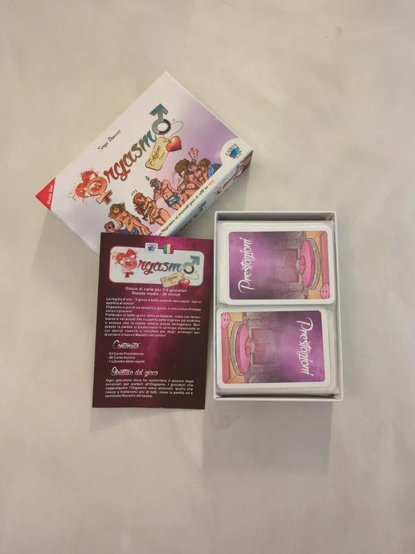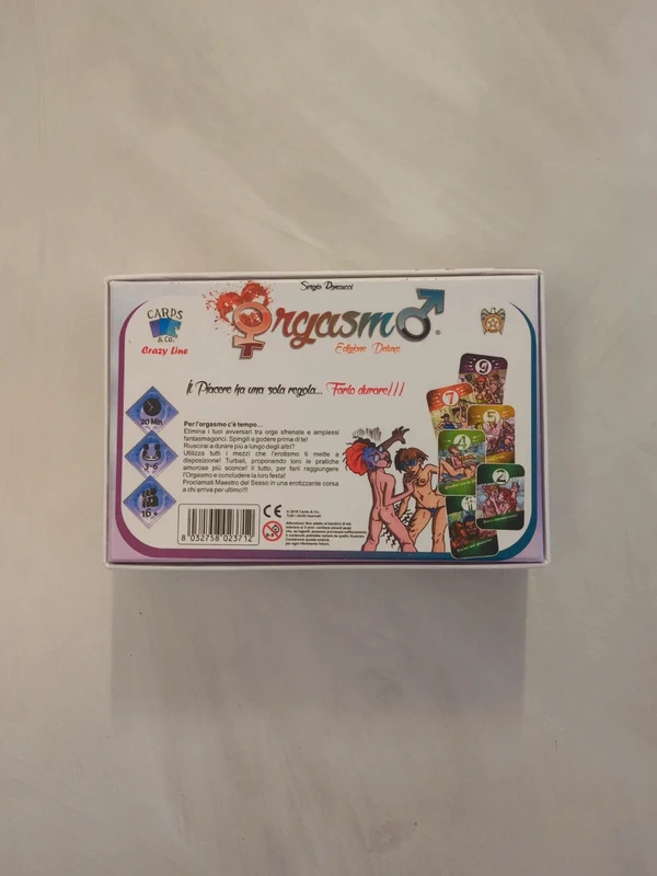 In this irriverent game you have to make your opponent reach pleasure by using Performance card named from 1 to 10, (the 10th card is Orgasmo, that eliminates the player who receive it).