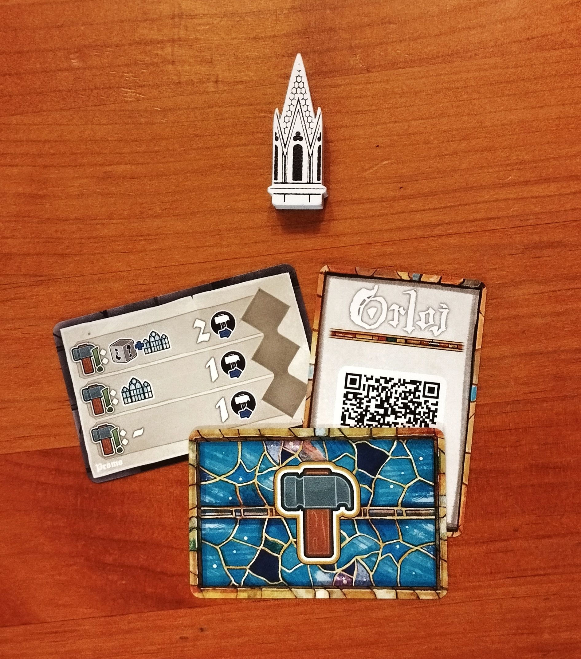 Descrizione: Promo given to limited buyers who purchased the game at Spiel 2025. It consists out of a wooden pinnacle, that can be used as an alternative round marker or first player marker and 2 additional hammer cards. One of them will give you the ability to expand your workshop (in combination with a free resource at level III) when building, the other will give you a free resource at level II and a free resource + the recovery of a worker at level III.