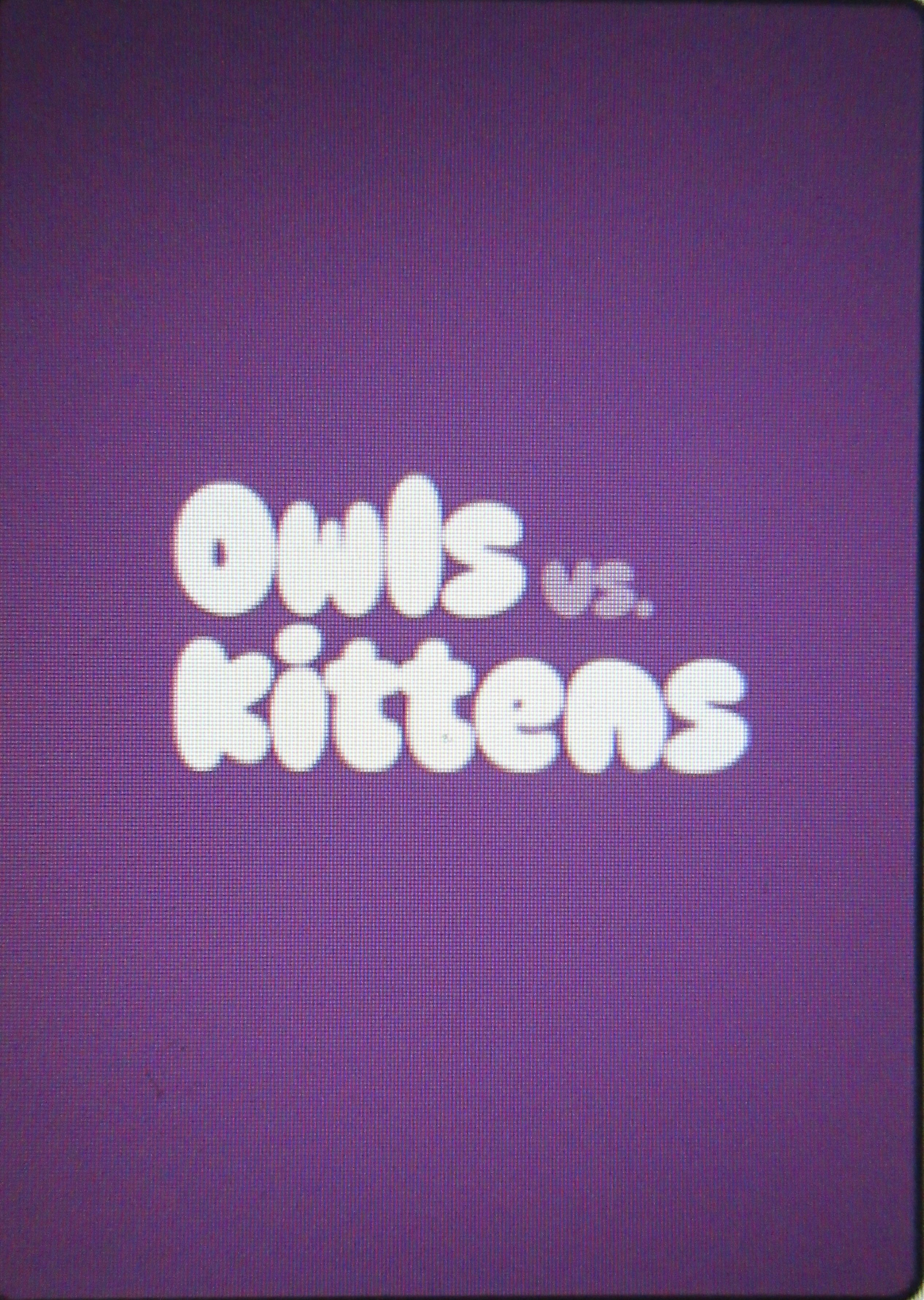 Descrizione: Players decide who will be Owls and who'll be Kittens, taking that respective deck. The Owl player goes first, placing a card in the center of an imaginary grid. The goal is to make three-in-a-row of one's chosen animal, allowing the person to collect every card on the table, ending the round. When both players run out of cards, the person who has collected the most wins.