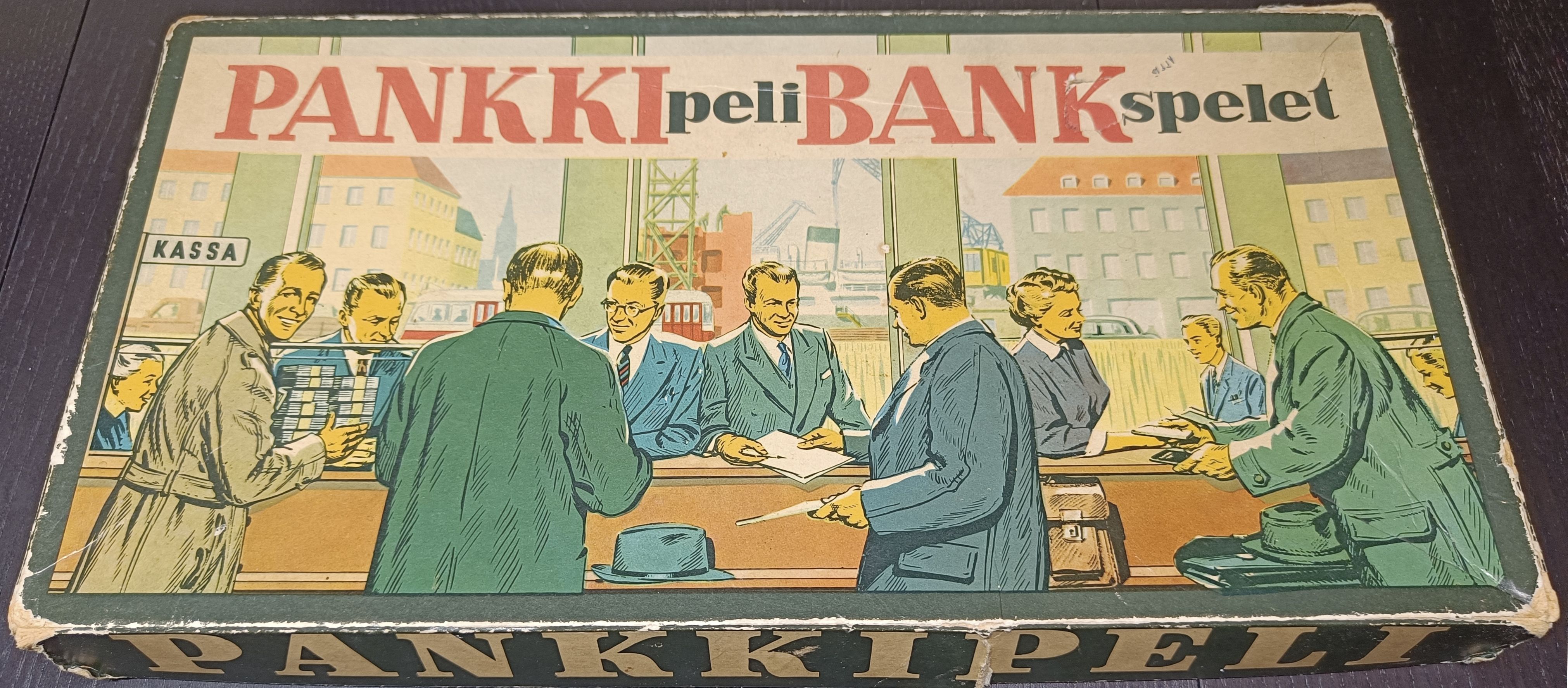 Descrizione: Pankkipeli is an economic board game, with 5 different roles: Construction engineer, Farmer, Industrialist, Businessman and Banker. Banker is some kind of game leader and he/she is in charge of the money, loans, chequing accounts and all other bank related affairs. Banker can't win or loose the game. Other four roles have their own routes to follow in the board (from 1 to 100) and they also have their own events on the way. Winner of the game is the player who got most money at the end. At the start of the game roles are randomly distributed to the players by throwing a die. After the roles have been determined, every player get 1 million marks on bit different distribution of assets (money, cheques, obligations, shares, and so on). On your turn you roll the die and go forward on your route and see what happens. On the way you might be able to buy or sell stocks, take loans, pay back loans, make deals with other players and so on. When every player has get through, then it's time to cash all your assets and pay all you debts. The winner is the player with most money.