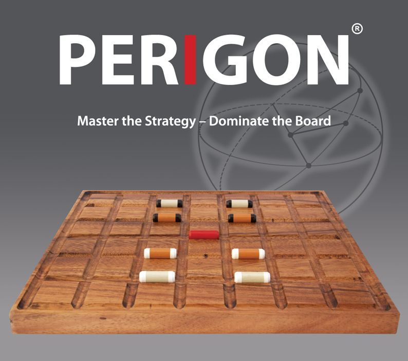Descrizione: Perigon is a two-player strategy game. The board is a seven-by-six grid with grooved grid lines. The intersections of the grid are known as Hubs. The pieces are solid cylinders that lie in the grooves of the board in between the Hubs. The grooves that lie along the longer edges of the board are the goal lines. Each player has two Woods and two Granites while the Flag is a communal piece.