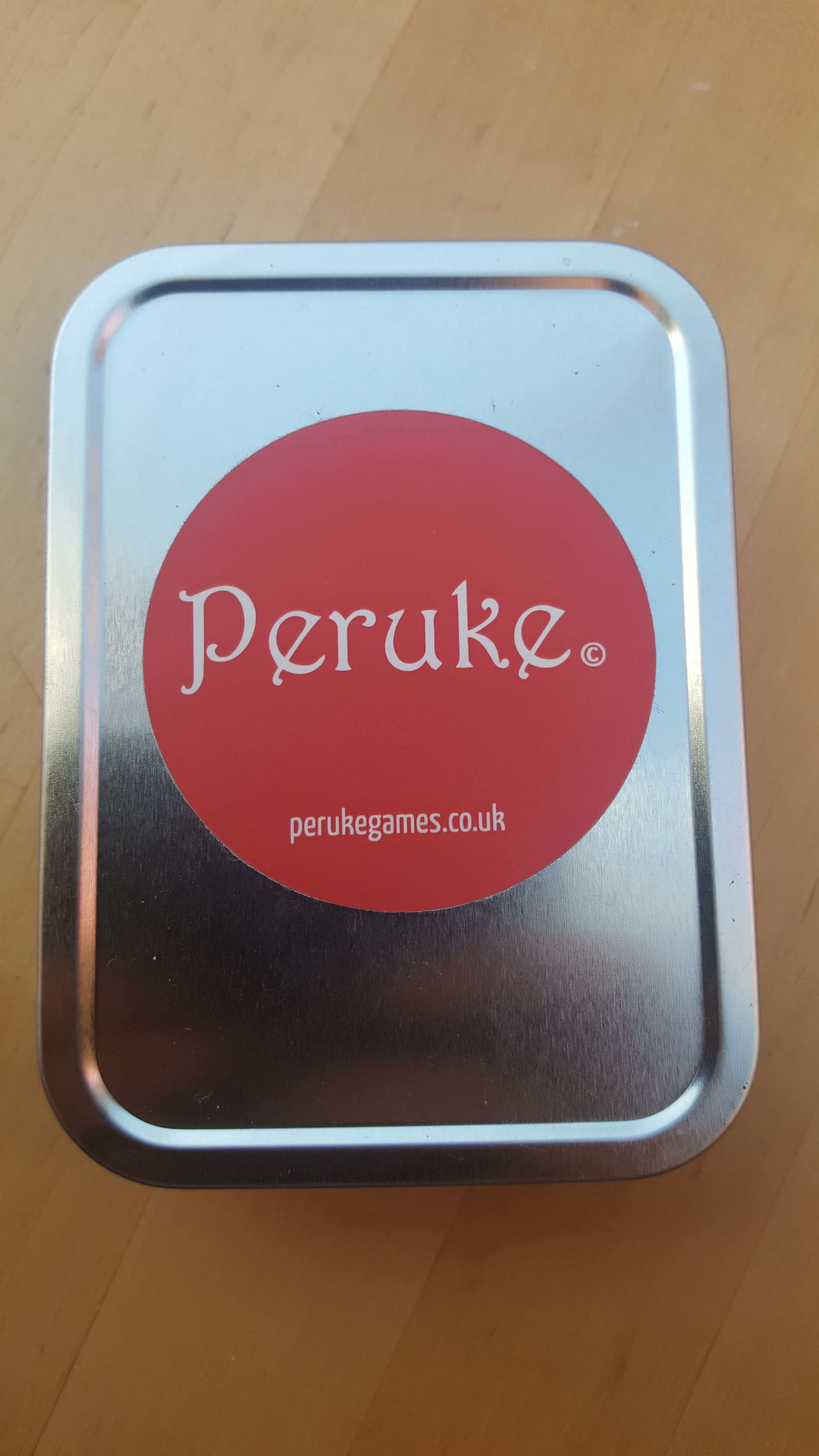 Inside the Peruke tin are 24 quality Birch ply discs (FSC), 3 dice & instructions for 2 player game & 3+ player game