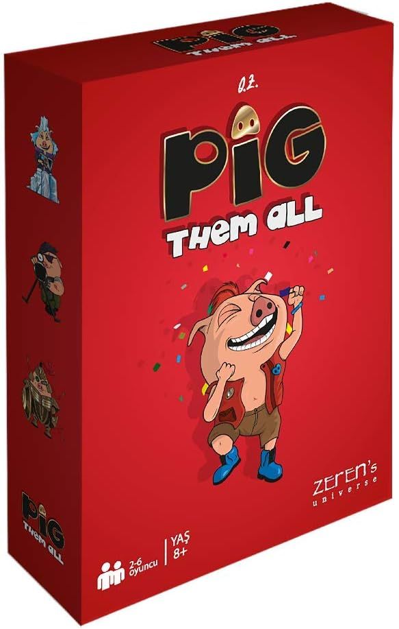 Descrizione: Pig Them All is a fun survival game for 2–6 players. Players try to eliminate their opponents by playing attack cards against each other while defending themselves from deadly strikes with defense cards. At times, they will use advantage cards to steal cards from their opponents or use special abilities with combo cards. But no matter what they do, only one player will survive and only that one player will win the game.