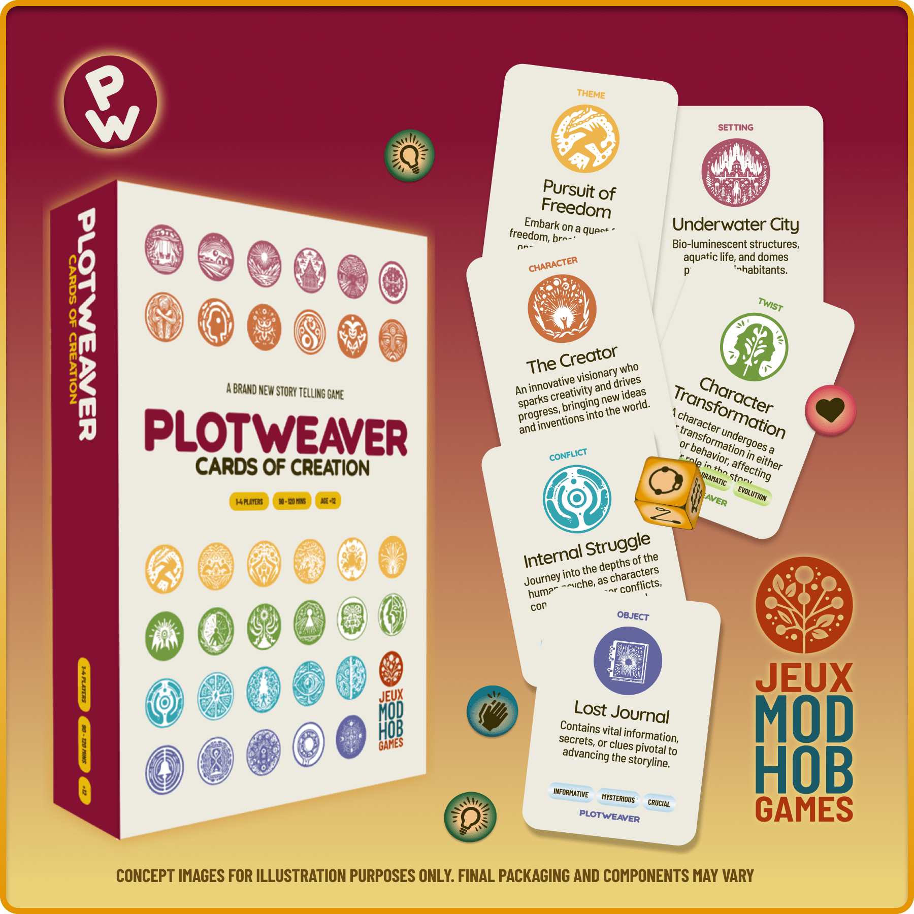 Descrizione: PlotWeaver: Cards of Creation is an imaginative, card-based storytelling game that invites players to craft their own narratives through a structured yet flexible framework. Players are guided by Story Patterns, such as the Monomyth or Circular Narrative, which provide the overarching structure of their stories. Throughout the game, players draw Story Element Cards that introduce characters, settings, conflicts, themes, and unexpected twists, driving the story forward in engaging and often surprising directions.