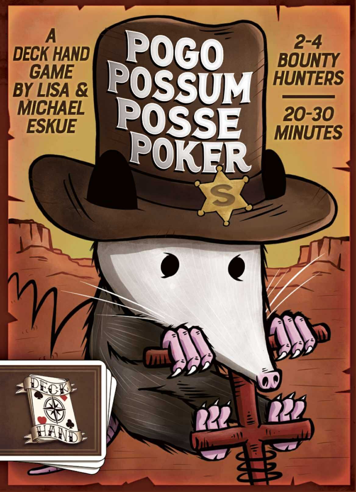 Descrizione: What is a Deck Hand game? It is an 18 card game that is used in conjunction with a standard Poker deck. Yeehaw! Get ready to play possum, round-up poker hands, and throw some outlaws in the hoosegow. In Pogo Possum Posse Poker, (2-4 players) take on the role of bounty hunters working alongside the famous Sheriff Wyatt O. Possum and his trusty pogo stick, Betsy. For greenhorns and veterans alike, players will use a unique card skipping mechanic to lasso up some playing cards to make specific poker hands, while they scout out and capture gangs of lawbreaking varmints in the Wild West. Combined with a standard deck of cards, your family is fixin’ to have a hootin', hollerin', and growlin’ good time, and see why Pogo Possum Posse Poker puts the ‘wild’ in the Wild Wild West. The goal of Pogo Possum Posse Poker is to be the bounty hunter at the end of the game with the most money. On your turn, you choose one of three actions: 1. Posse up!: Gather cards to add to your hand. You will automatically hop one space forward around the Okey Dokey Corral (because you're on pogo sticks!). From there, you'll have the option of collecting all the cards at that location or discarding a card from your hand to advance another space. You can continue to discard cards and advance until you choose to stop and pick up cards. 2. Scout an outlaw: Track and get the bead on outlaws. By playing the specific poker hand in cards from your hand, you can scout outlaws from the Badlands, and take them to your play area. Each outlaw will give you a special power that will let you use some cards as wild cards, collect extra cards, or move extra spaces! You can have up to three outlaws in front of you at any given time. 3. Jail an outlaw: Play larger poker hands on the outlaws you've tracked to flip them and put them in jail! You will lose that outlaw's special power, but gain the cash bounty for big points at the end of the game. Every jailed outlaw also increases your hand limit by +1, so you can get back on your horse and posse up again! When the outlaw deck is empty, all players get one more turn to play poker hands and jail characters they have tracked. Then you'll count up your score. Players score the cash bounty on all jailed outlaws, a cash bonus for outlaws from the same gang, and one point for each outlaw you still have scouted. The player who collected the most reward money is the rootin'est, tootin'est possum in the wild, wild West!