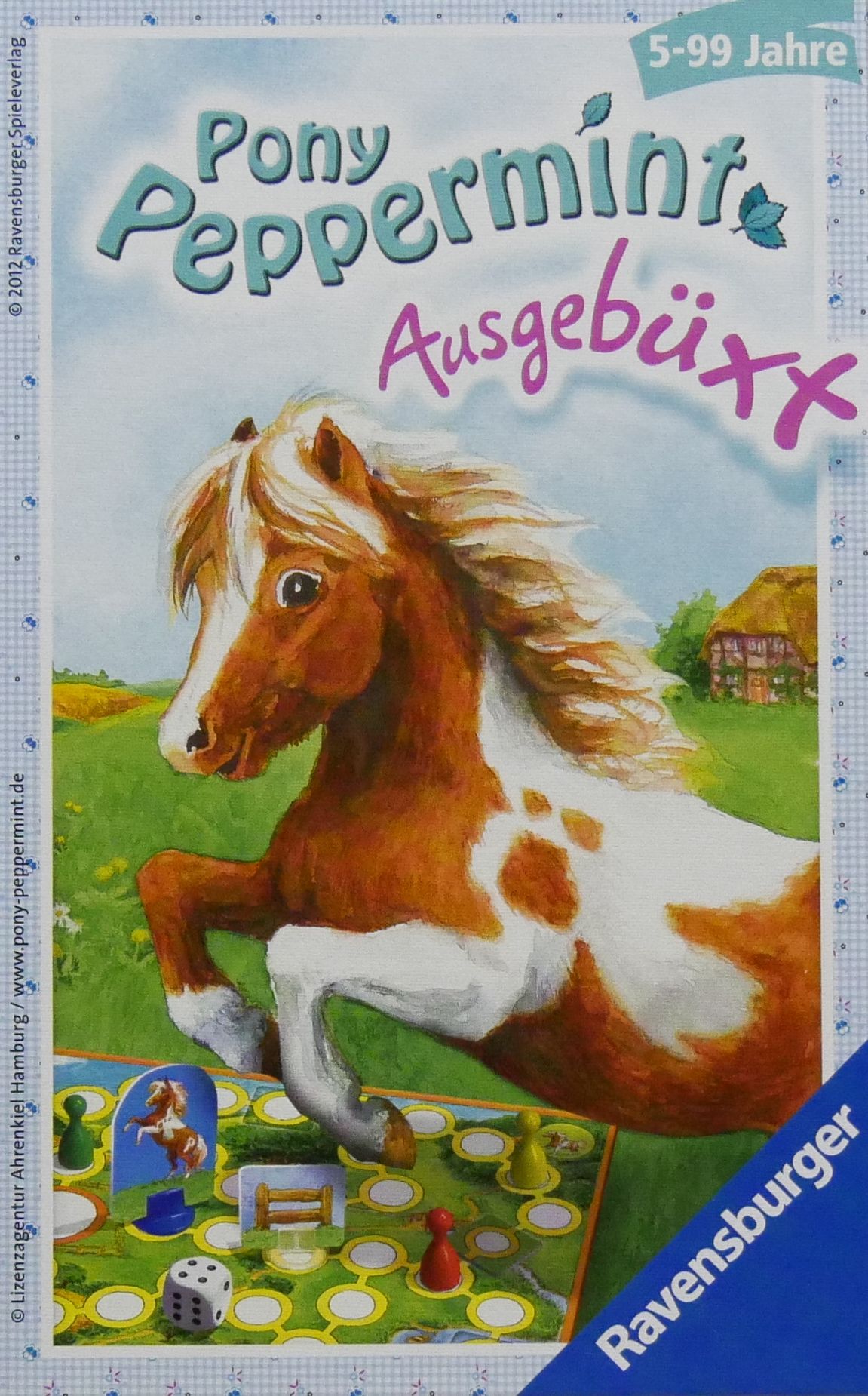 Descrizione: The children are searching for pony Peppermint. Therefore, the players take turns in rolling the dice and running on the game board to find it on the hiding cards. If a player finds the pony, s/he has to move it to the meadow. The other players try to prevent that of course and catch the token before.