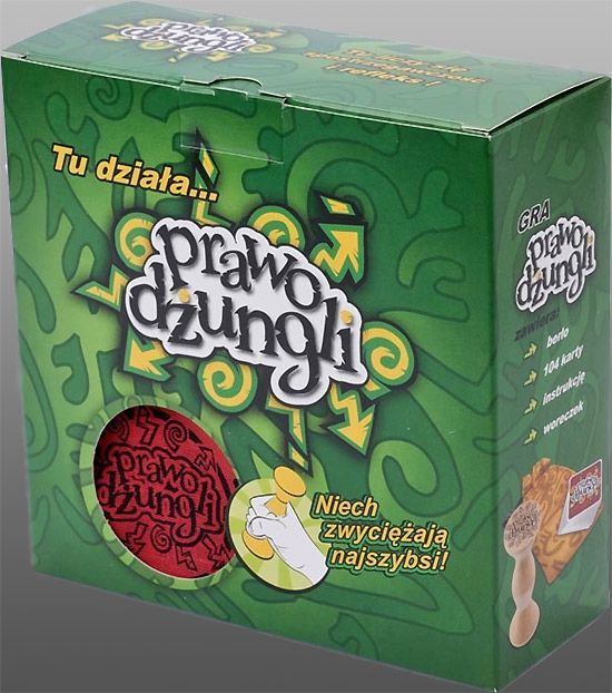 In Prawo Dżungli (which means "Jungle Law"), players must get rid of all their cards as fast as possible. Each turn, each player reveals one of their cards as a simultaneous action. If two or more cards are identical, their owners try to catch the "sceptre" as fast as possible. The fastest player then gives their card to one of the opponents. But if an incorrect person touches the sceptre they must take cards from other players.