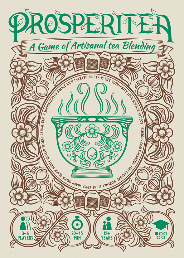 Descrizione: In Prosperitea, you are the proprietor of a small artisanal tea shop in a local neighborhood. Like all artisans, you pride yourself on your craftsmanship and strive to be the most prestigious shop in town. You will source ingredients, then blend them into a wide variety of teas to satisfy the demand of local market. Sell your teas for instant profits to secure more ingredients or display them in your shop window for prestige. The shop with the most Prestige at the end of the game is the winner!