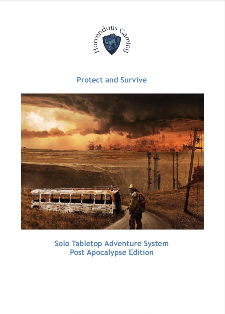Descrizione: Protect and Survive is a solo tabletop adventure game where you are the Response Team Leader for a community of humans trying to survive after a calamity has beset the Earth. You will lead your Team into danger and strive to bring them back safe through a series of battles against those who would threaten the very existence of your community. Each game takes the form of a battle between the Team and another group, and sometimes includes some additional task or conditions to fulfill to keep your adventure progressing.