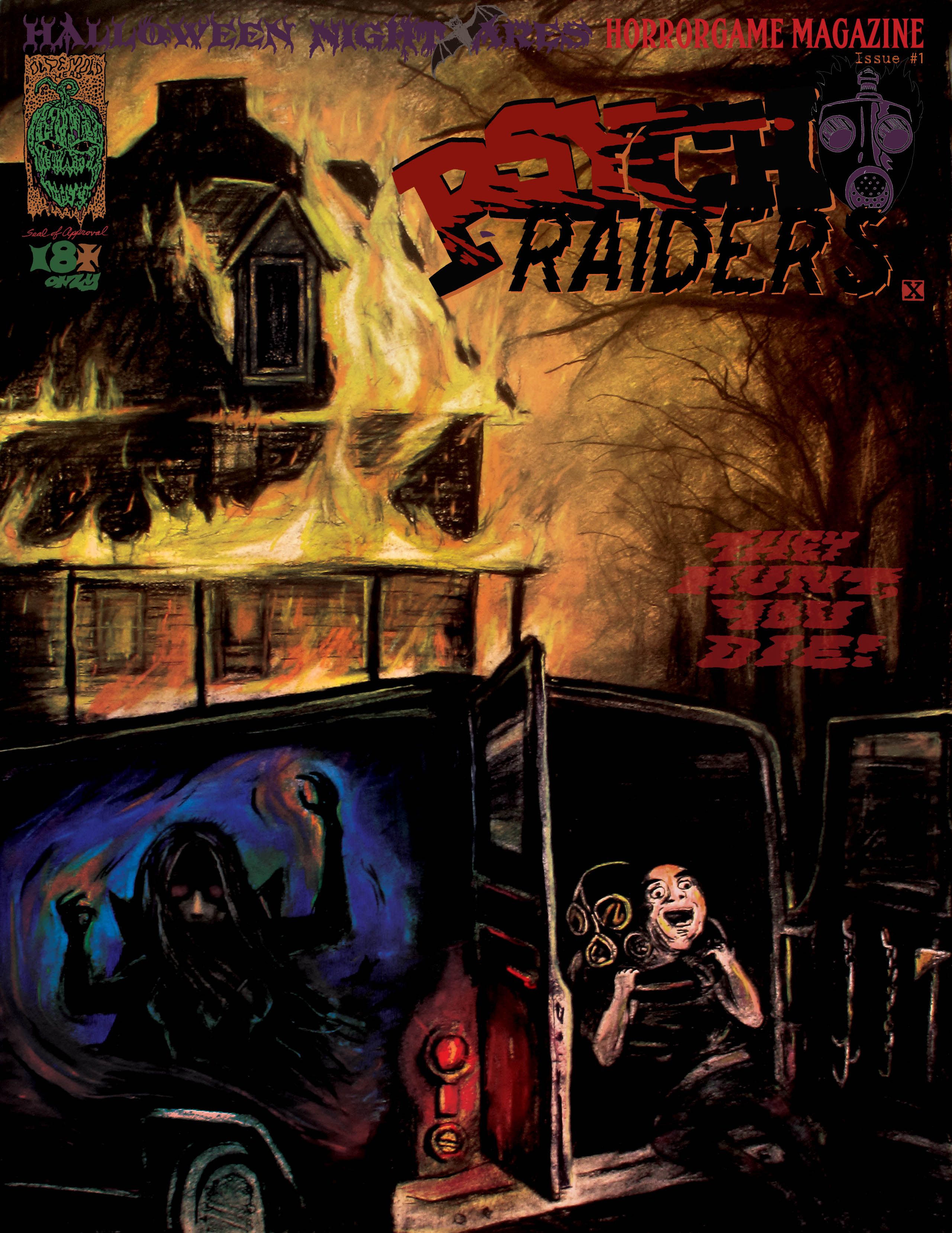 Note: Psycho Raiders is the first game featured in our "Halloween Nightmares Horrorgame Magazine", a game magazine dedicated to Halloween and the Horrorgame genre. Players will need to xerox elements and provide two D6 and pencils to play this game