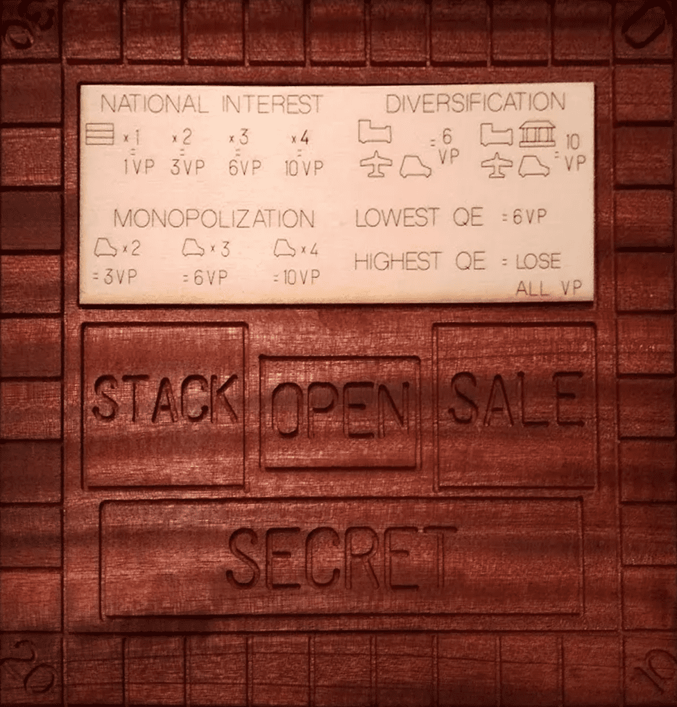 Player markers on the scoring track now reveal which player has the most victory points, but this is not the end. Players must now add up the amount of money they printed and the player who printed the most money loses all their victory points!