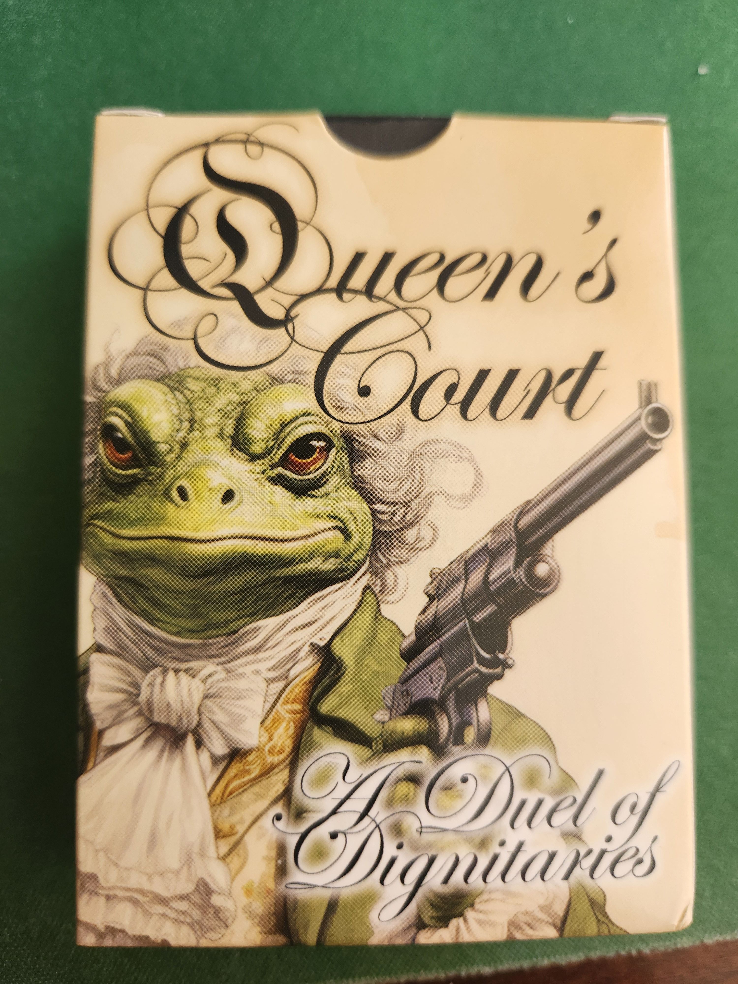 Descrizione: Step into the elegant world of Queen's Court: A duel of Dignitaries where strategic prowess and refined cunning reign supreme. Compete against fellow dignitaries in a battle of wits and card play to achieve the lowest spread between your royal piles. Claim victory in this captivating blend of regal intrigue and gentlemanly competition! This fast pace card game will immerse you in a world of rivalries and tactical brilliance, where every calculated move shapes the outcome. The path to victory lies in mastering the art of card management and offensive strategic card play. —description from the designer