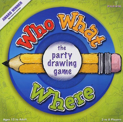 Descrizione: In this outrageous drawing game the object is to try to get other players to guess the WHO, WHAT and WHERE scene you've drawn. To play, each player picks a WHO card, a WHAT card and a WHERE card and then begins drawing the ridiculous scene described on the cards (such as "Prince Charles Performing Ballet In Egypt").