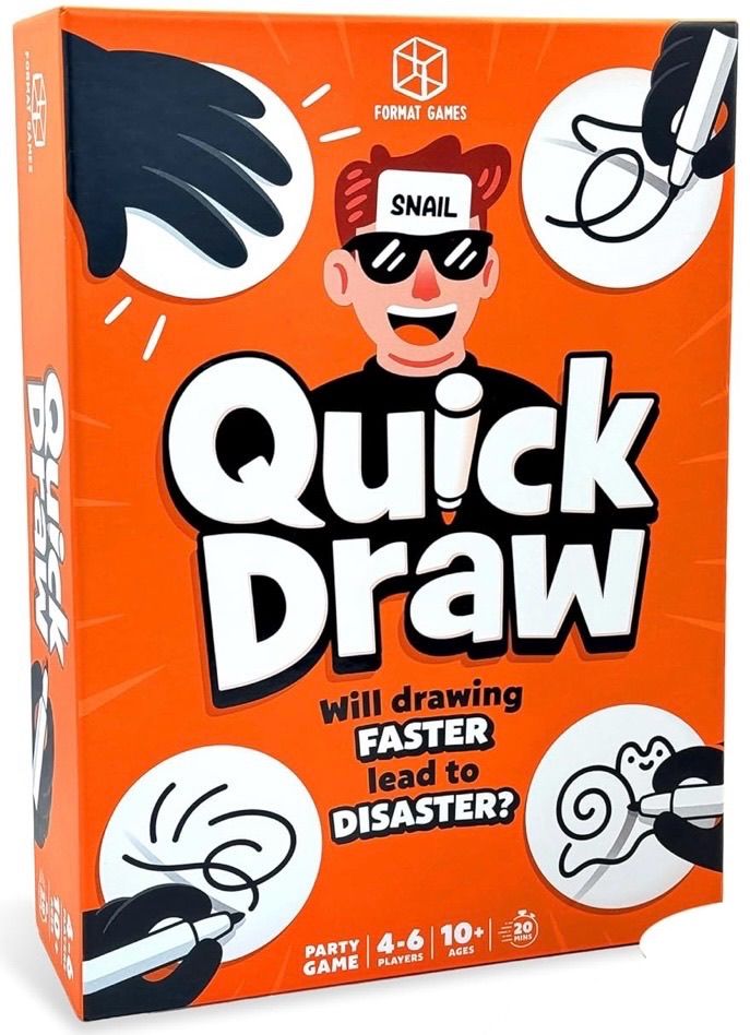 Descrizione: Jump into action with Quick Draw, where players race against time to draw prompts and guess correctly, making every round a thrilling challenge. It’s all pens at the ready in this fast-paced fun-filled drawing game! One player wears the shades with a prompt card. It’s up to the other players to draw the prompt as quickly as they can and slam their drawing down in the first place spot on the board. Second to finish drawing puts their scribble on 2nd place, and so on. The guesser then removes the shades and tries to figure out what on earth’s been drawn! —description from the publisher