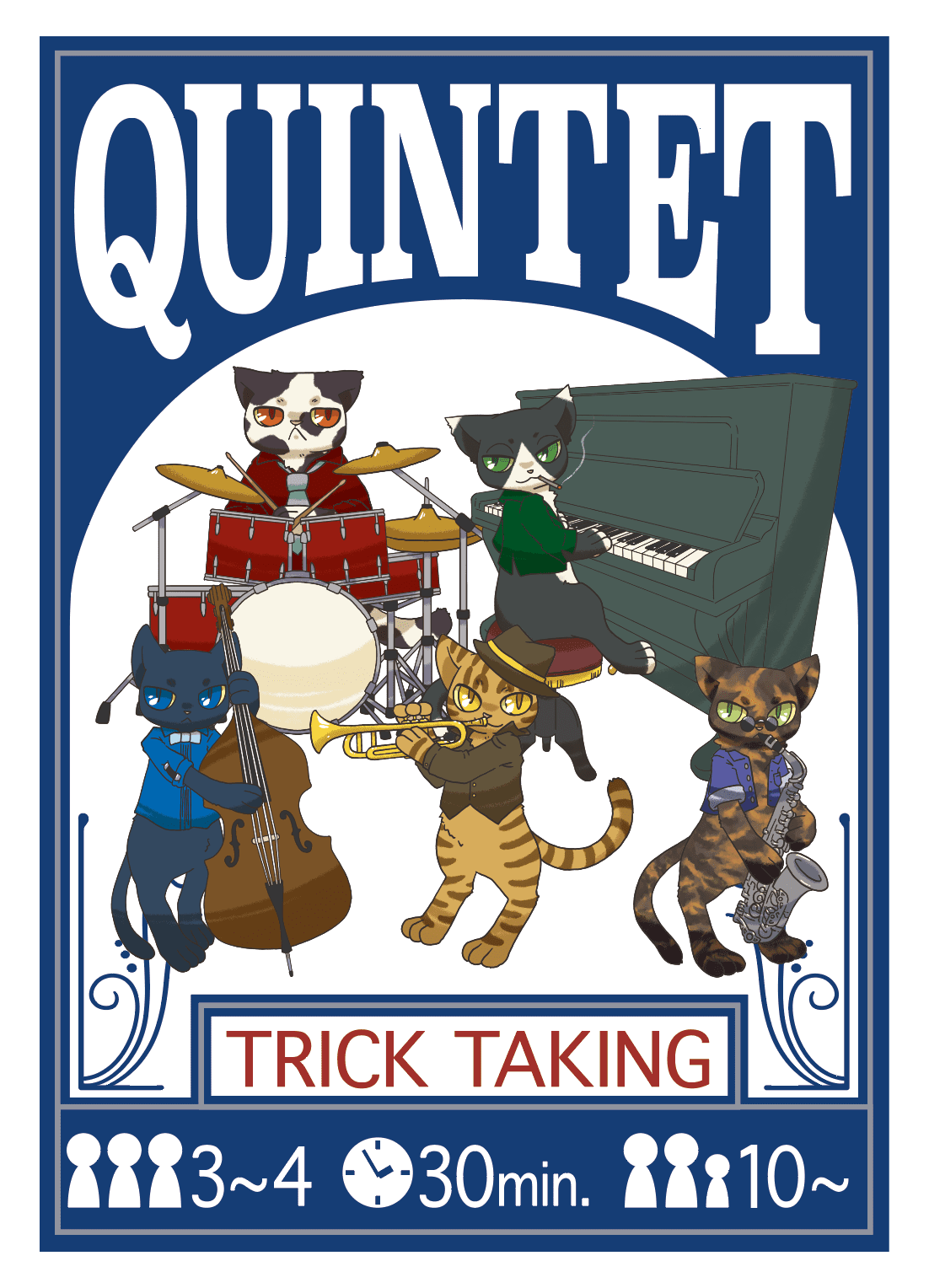 Quintet is a trick-taking game in which players try to collect cards that sum exactly to five, while avoiding cards worth negative points. The lead player must play two cards instead of one, causing hands to shrink unevenly over time. The game ends when any player runs out of cards, and players score based on collected sets and remaining cards.
