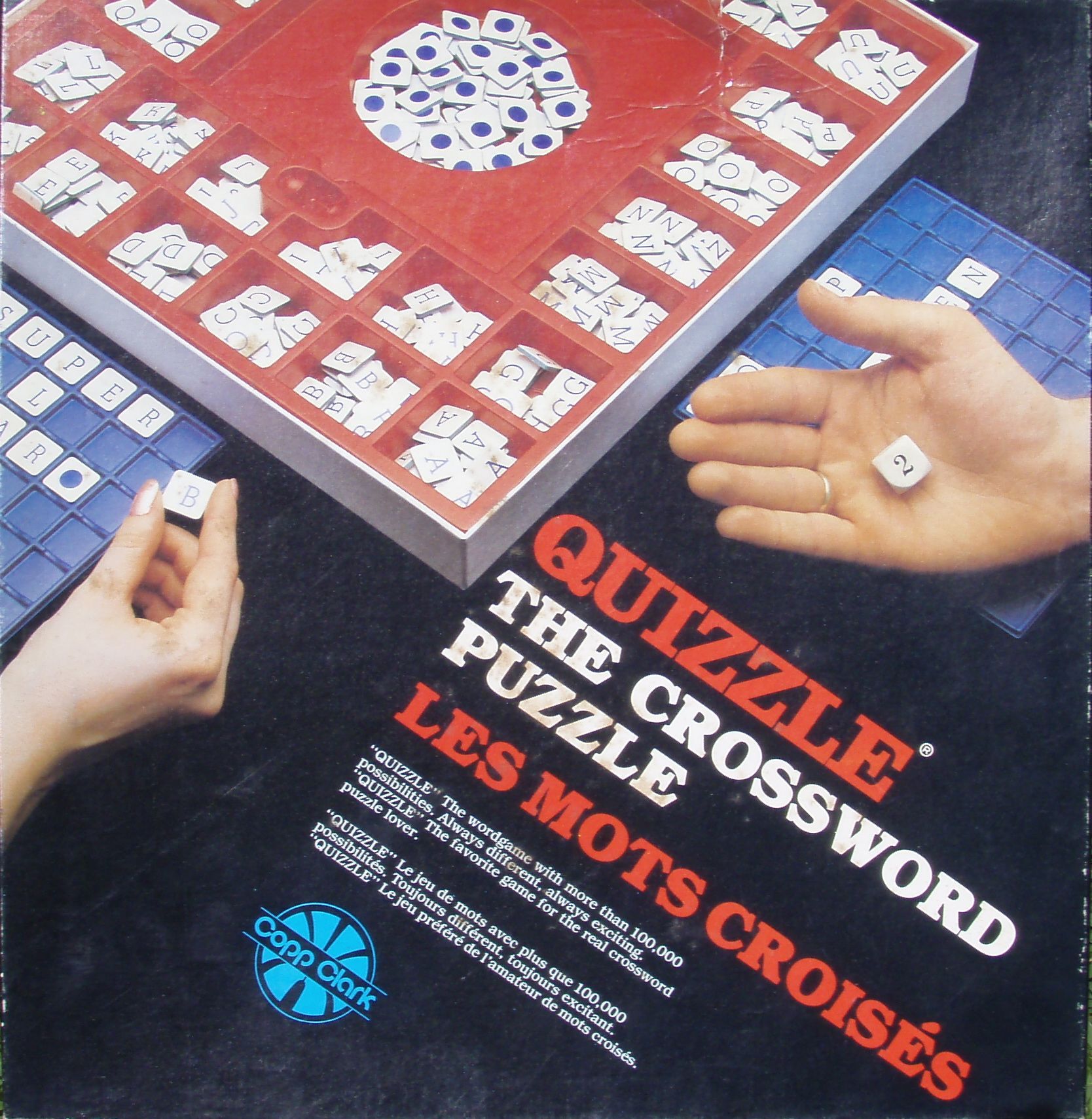 Descrizione: Quizzle contains four plastic crossword grids, a supply of cardboard letter tiles (also wild blanks and black squares) and a special die marked (1 1 2 2 3 *). On a player's turn, he rolls the die and places that many letters of his choice on the grid (other players simultaneously draw the same tiles but place them on their own grids as they choose). A Joker (*) counts for either 3 tiles or the replacement of an already-played tile. The game ends once the grid is filled. Only completed words count for score.